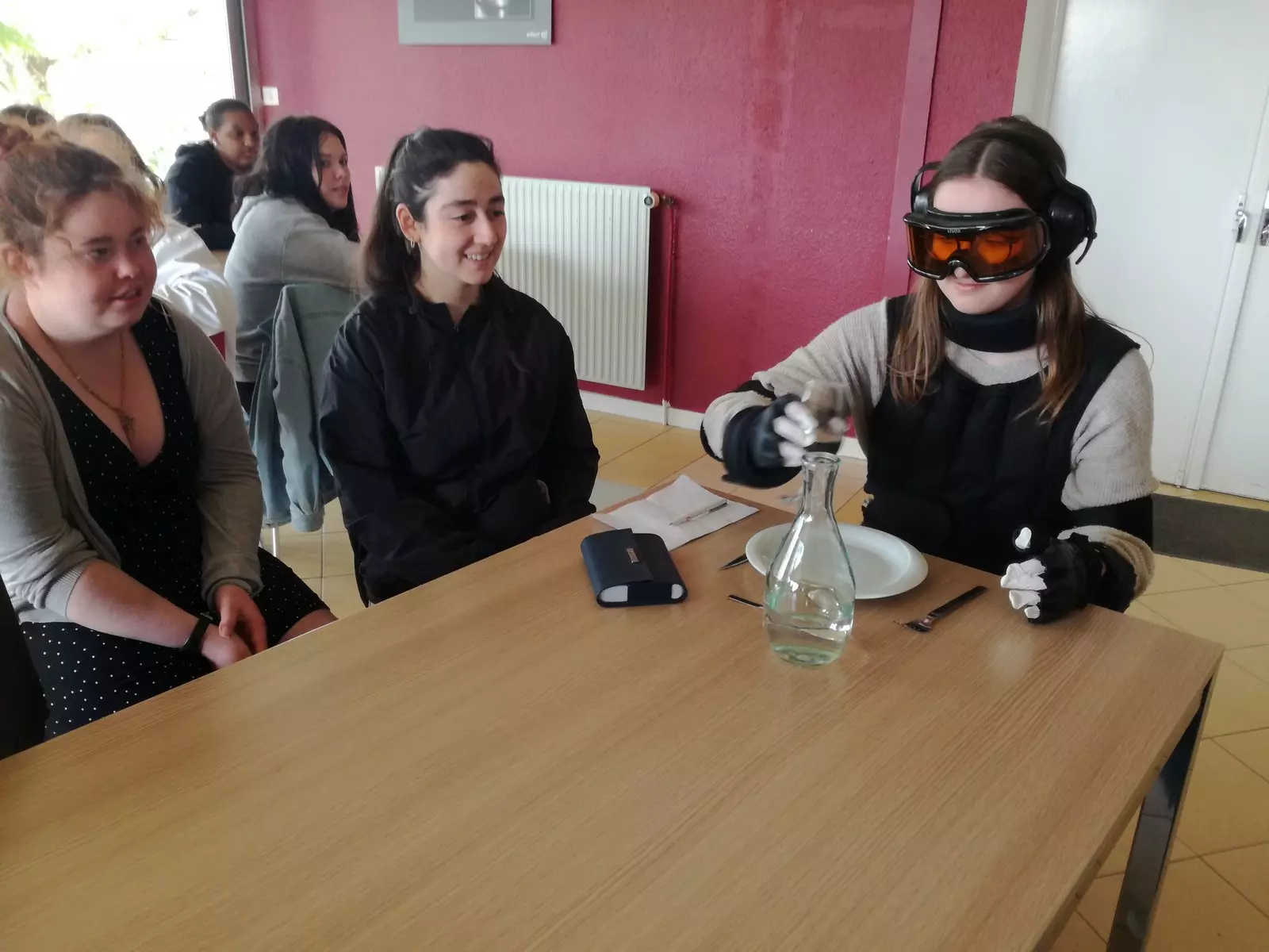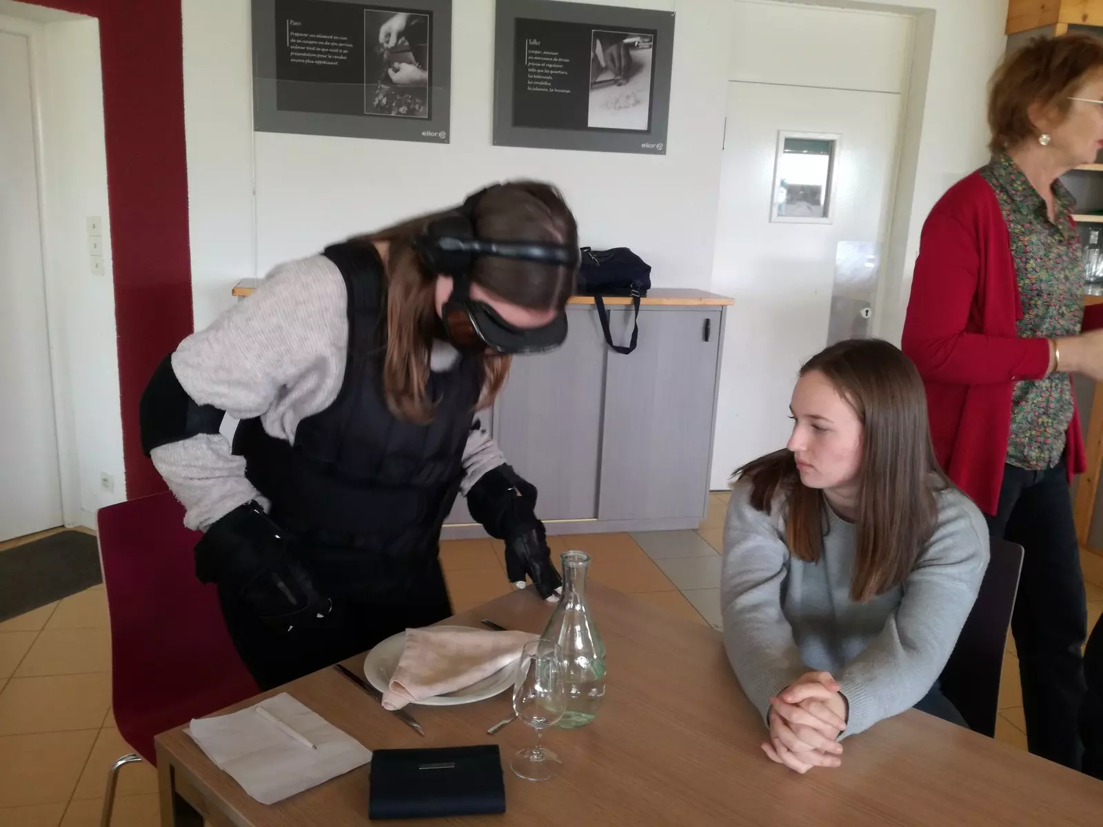 C’est tout d’abord au restaurant pédagogique du lycée que chaque élève a pu s’équiper du kit de vieillissement, une tenue de plus de 18 kilos pour apprécier le poids des ans sur le corps, les articulations et aussi sur les sens… une expérience originale pour découvrir les déficiences progressives que subissent les séniors, pour mieux sentir leurs difficultés au quotidien comme : raideurs des articulations, champ de vision rétréci, perte d’audition, gestes plus imprécis, douleurs, lourdeur, lenteur…. Cette expérience (vécue aussi le matin par les élèves de la classe de Terminale) est très formatrice.