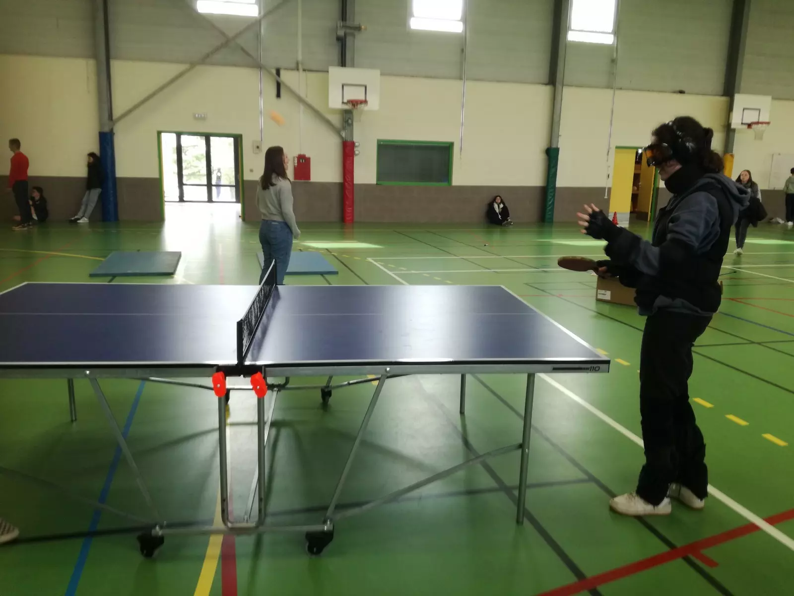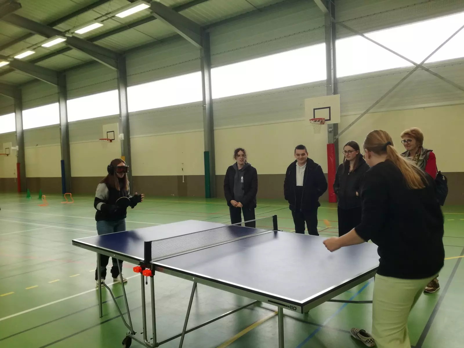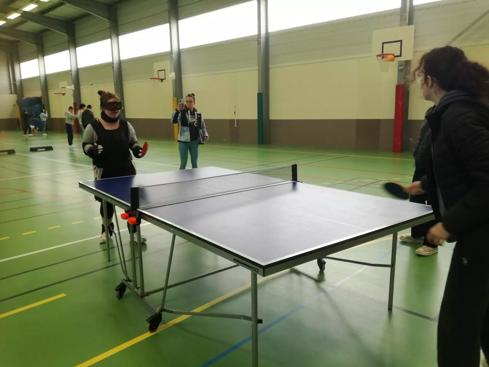Direction la salle des sports, toujours avec la combinaison de vieillissement qui fait aussi office de simulateur de handicaps. « C’est fatiguant de marcher », « les pas sont lourds », « pas facile de tenir et de bien sentir la raquette», « inutile de me parler même fort, je n’entends rien de rien, surtout dans cette grande salle», « les tirs ne peuvent pas être précis », « je vise à côté », « A des moments, je ne vois plus la balle : elle n’est plus dans mon champ de vision », « c’est trop dur», « on comprend mieux pourquoi les personnes qui vivent des déficiences peuvent s’isoler, ne plus avoir envie d’être en groupe ou encore cherchent à limiter les gestes et déplacements car tout devient trop dur et inaccessible…».