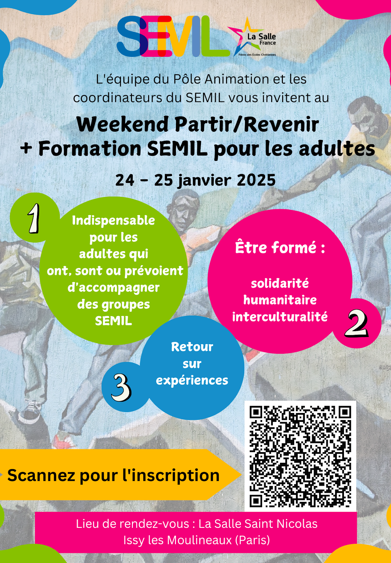 L’équipe du Pôle Animation (Hummas Sohail, frère Brice, Laurent Vrigron) et les coordinateurs régionaux du SEMIL (Service Educatif des Missions Internationales LaSaliennes) ont organisé un temps de rencontre nationale intitulé « les 24 heures partir revenir pour les accompagnateurs du SEMIL ».