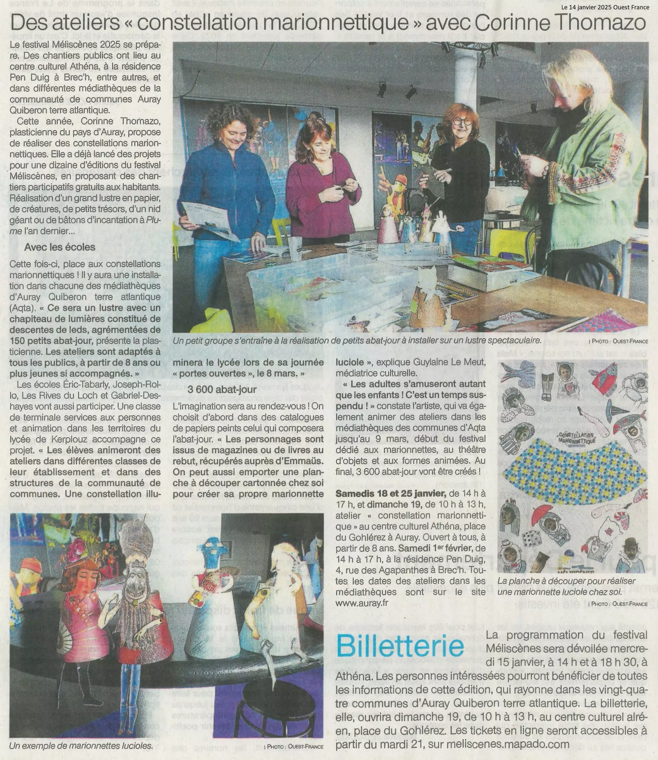 Toutes ces lucioles créées seront ensuite assemblées en constellations marionnettiques. Le 8 mars, jour de la porte ouverte du lycée de KERPLOUZ LASALLE, ces œuvres collectives s’illumineront sur tout le territoire AQTA pour ouvrir le 24ème festival MELISCENES, festival de marionnettes et théâtre d’objets.