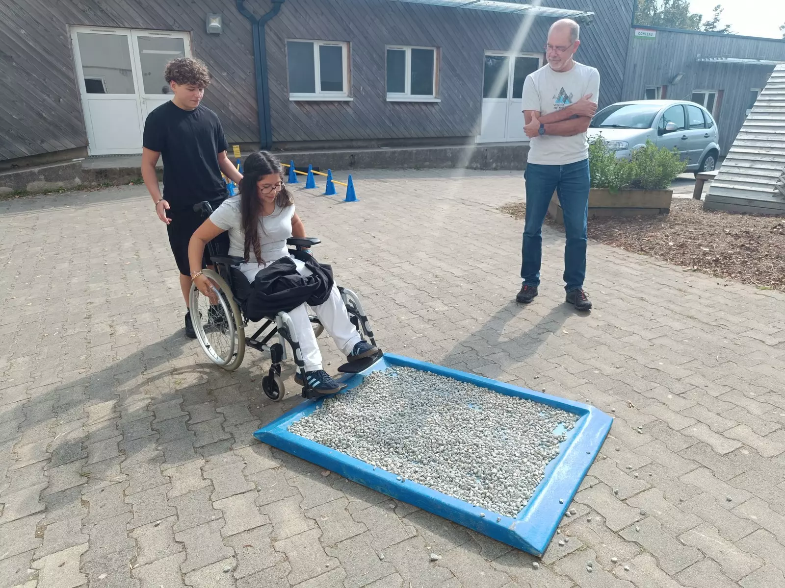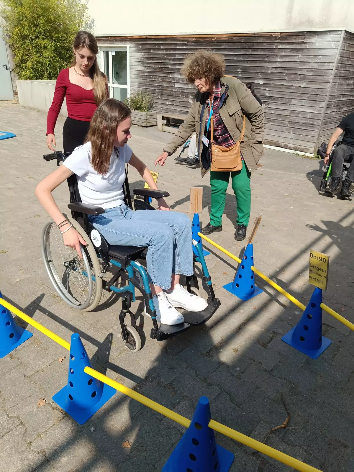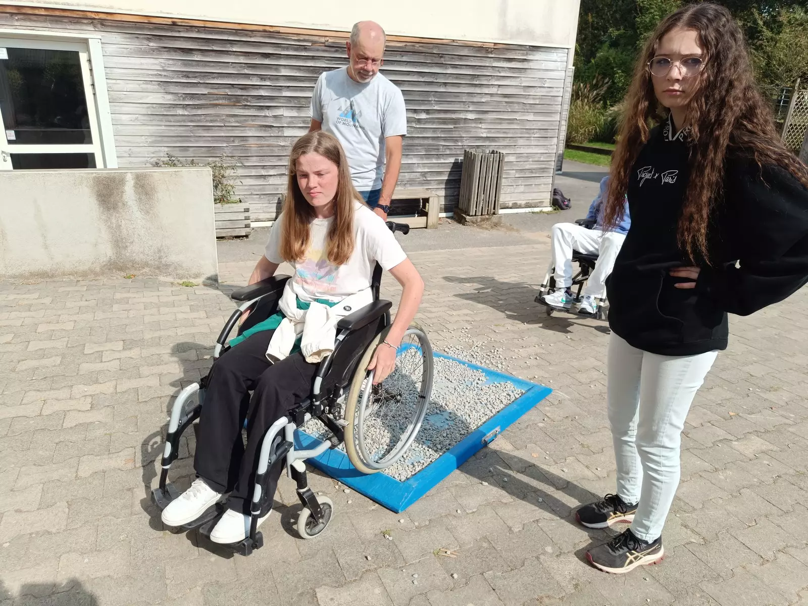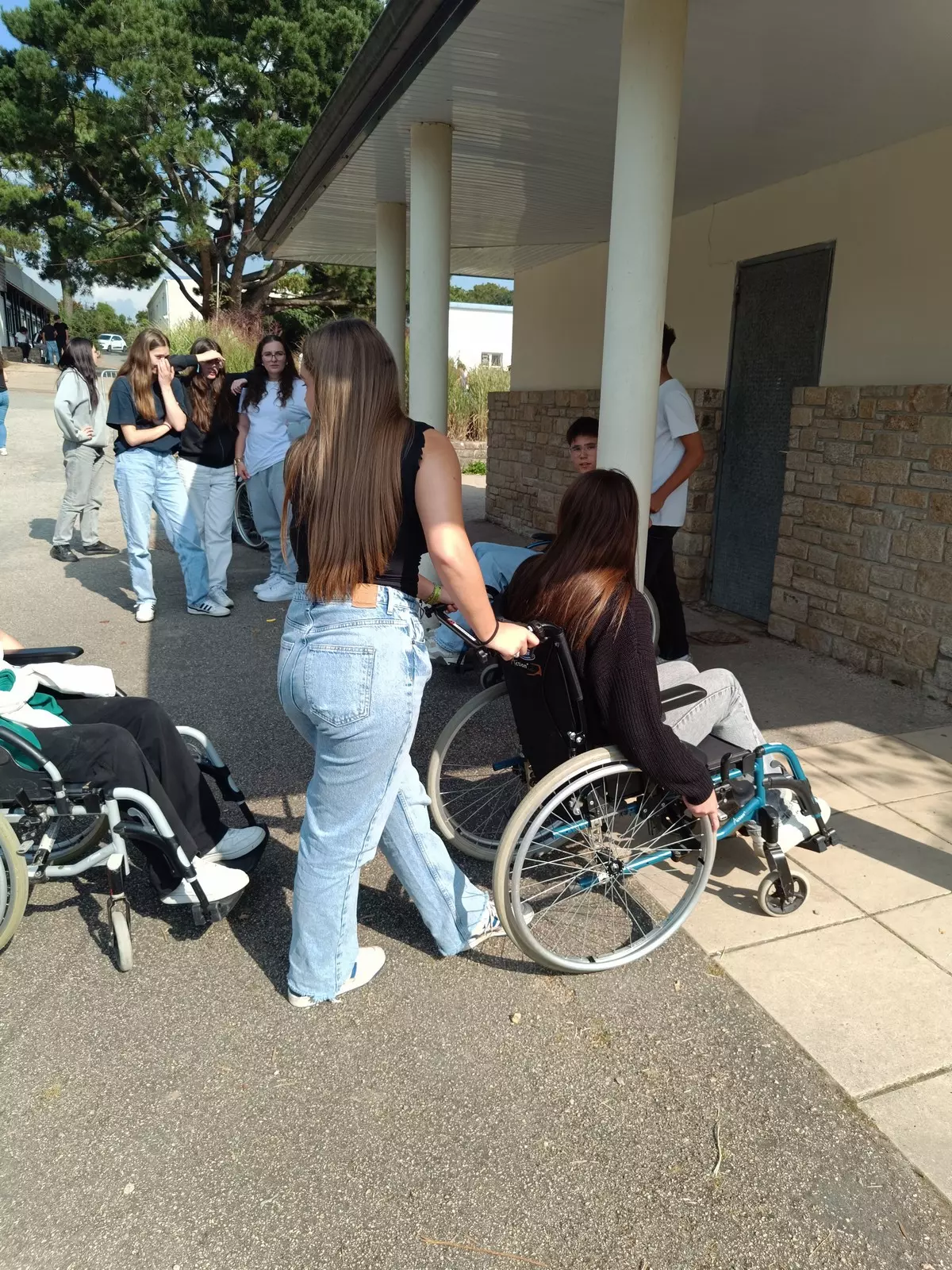 – En testant le fauteuil mécanique (en autonomie, en étant poussés ou en poussant une camarade en fauteuil),