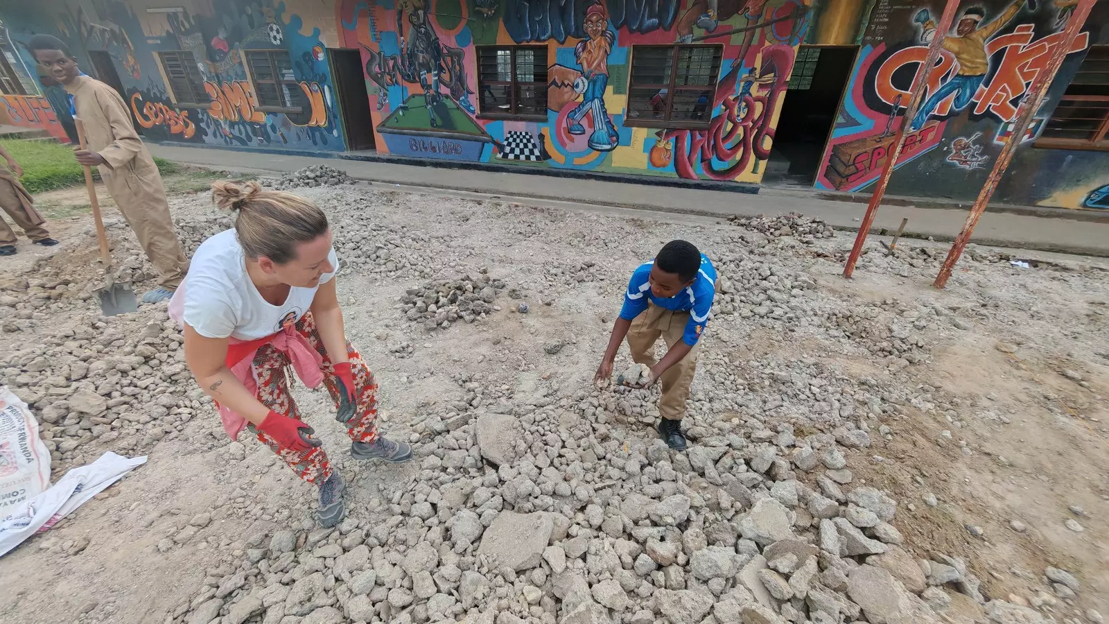 Le chantier commence dès le lendemain ! Chaque matinée de la semaine et parfois les après-midis, nous sommes au service des professionnels locaux. On participe à la déconstruction du terrain, au tri des pierres, à la réutilisation des ressources : « nous sommes surpris par le peu de mécanisation, peu de pelles, ni de brouettes. Nous sommes aussi impressionnés par le poids que les femmes peuvent naturellement porter sur leur tête ! ».