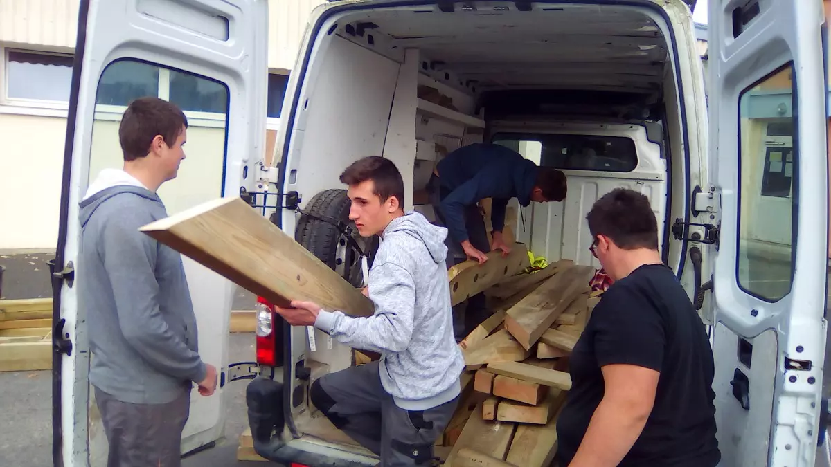 Ensuite, avec l’aide de Dominique, le chef d’exploitation, et les 2nde Pro, l’ensemble des modules et des pièces d’assemblage a été déplacé au Collège. Nous y avons été très bien acceuillis.