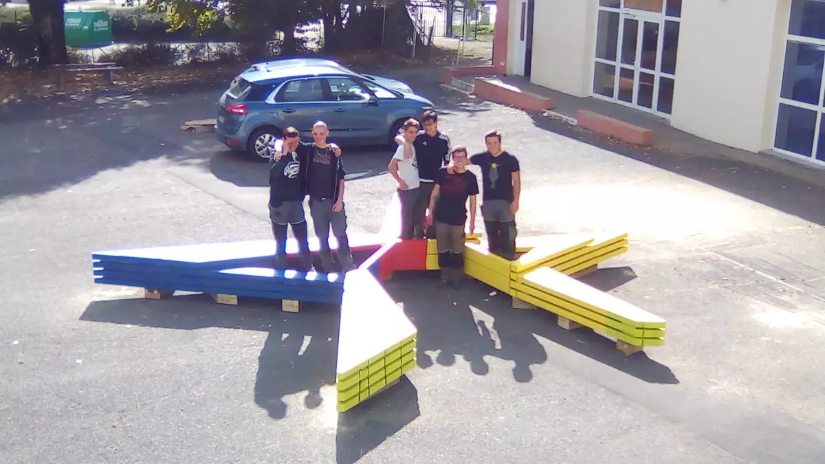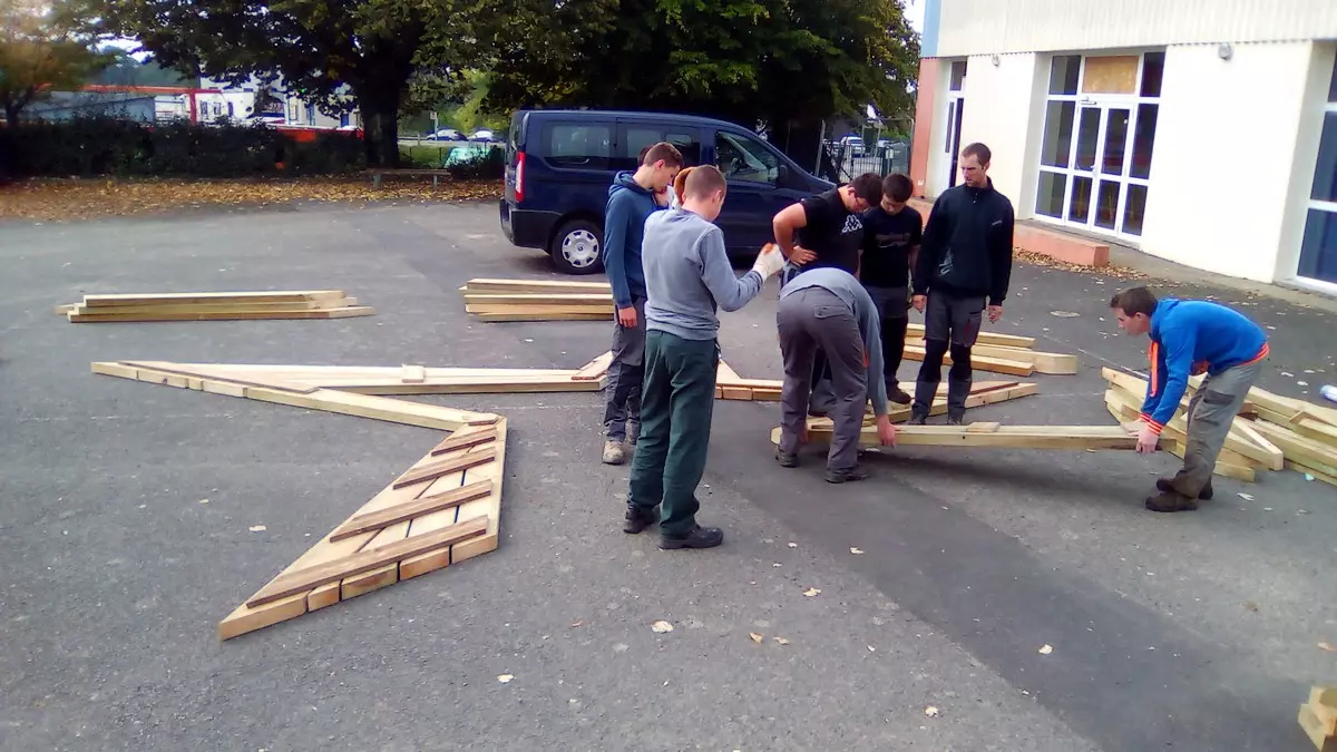 Sur 3 semaines, ce sont ainsi plus de 80 élèves et 55 heures de travail qui ont été nécessaires à la découpe de plus de 150 ml de poutres et au vissage de près de 500 vis pour parvenir à la concrétisation de l’étoile.