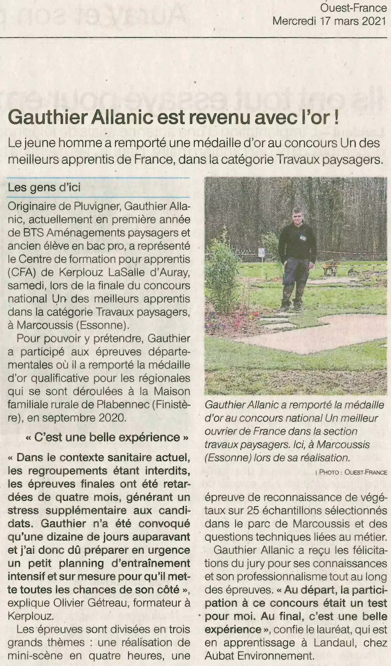 Gauthier Allanic est revenu avec l’Or par CDI | 17 Mar 2021 | BTSa Aménagements Paysagers (apprentis), Concours, La presse en parle | 0 commentaires Poster le commentaire Annuler la réponseVotre adresse e-mail ne sera pas publiée. Les champs obligatoires sont indiqués avec *Commentaire * Nom * E-mail * Site web Δ Ce site utilise Akismet pour réduire les indésirables. En savoir plus sur la façon dont les données de vos commentaires sont traitées.