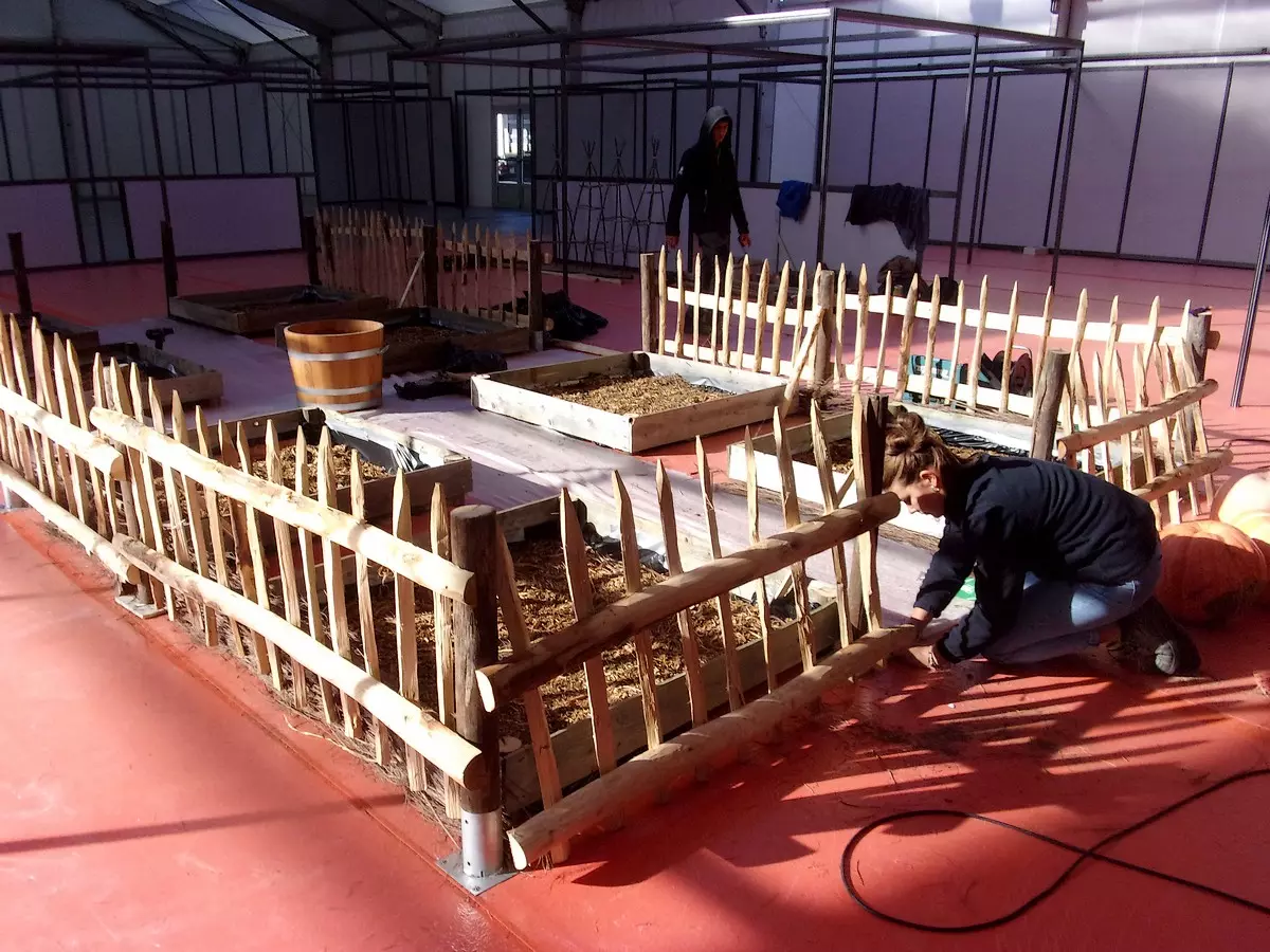 Le plan retenu s’insère parfaitement au lieu : jardin clos en claie de châtaignier de 80cm de hauteur sur tout le périmètre ; à l’intérieur des carrés de 1m40 de côté ; des cultures sont réalisées sur les plates-bandes surélevées consolidées par des planches.