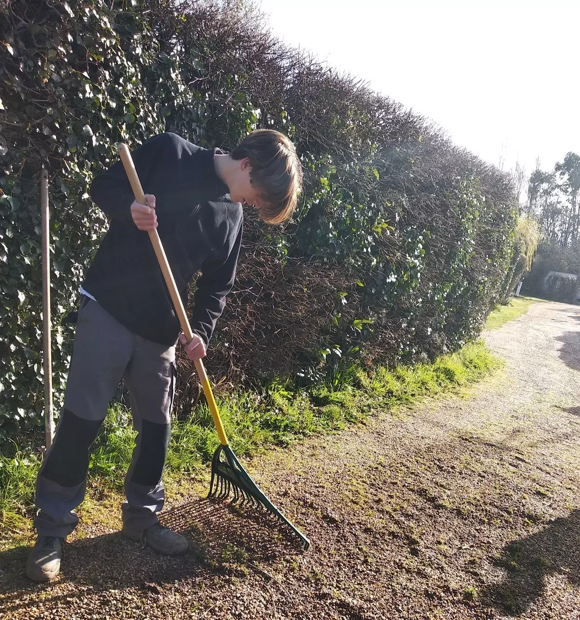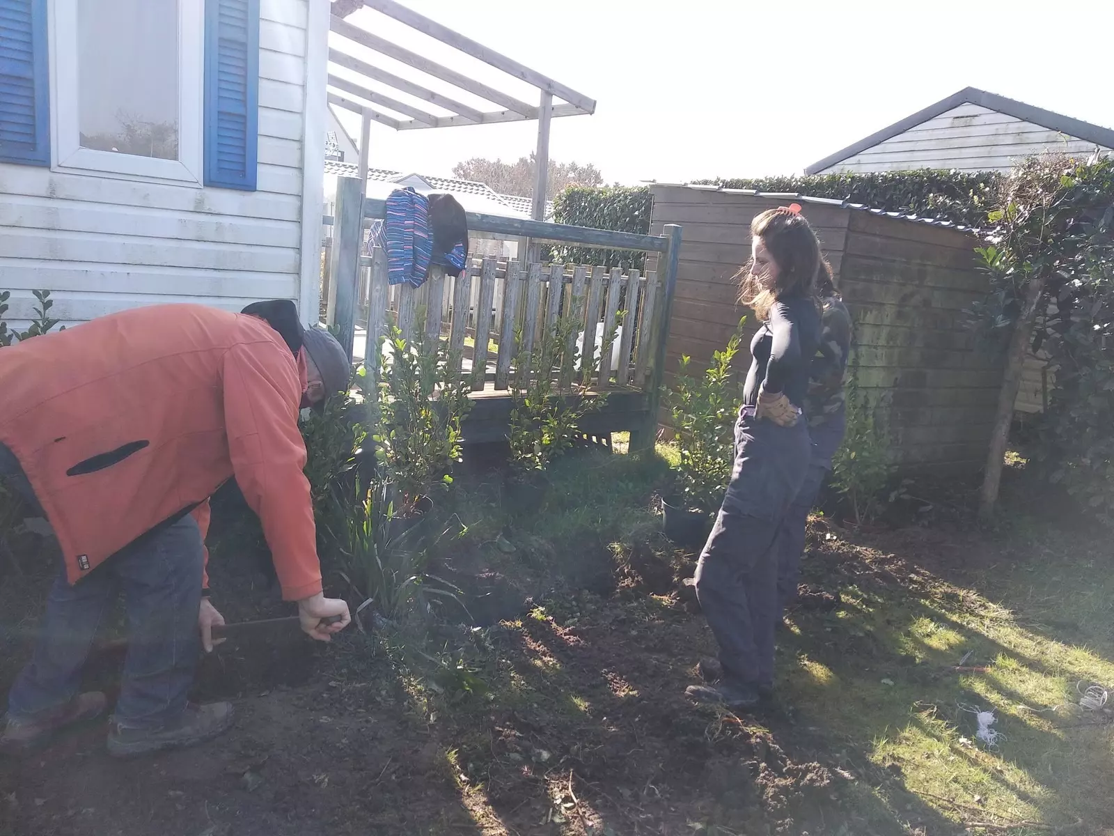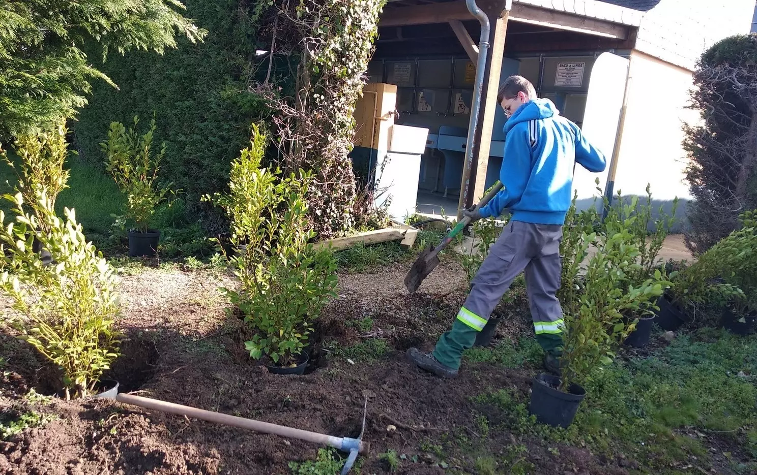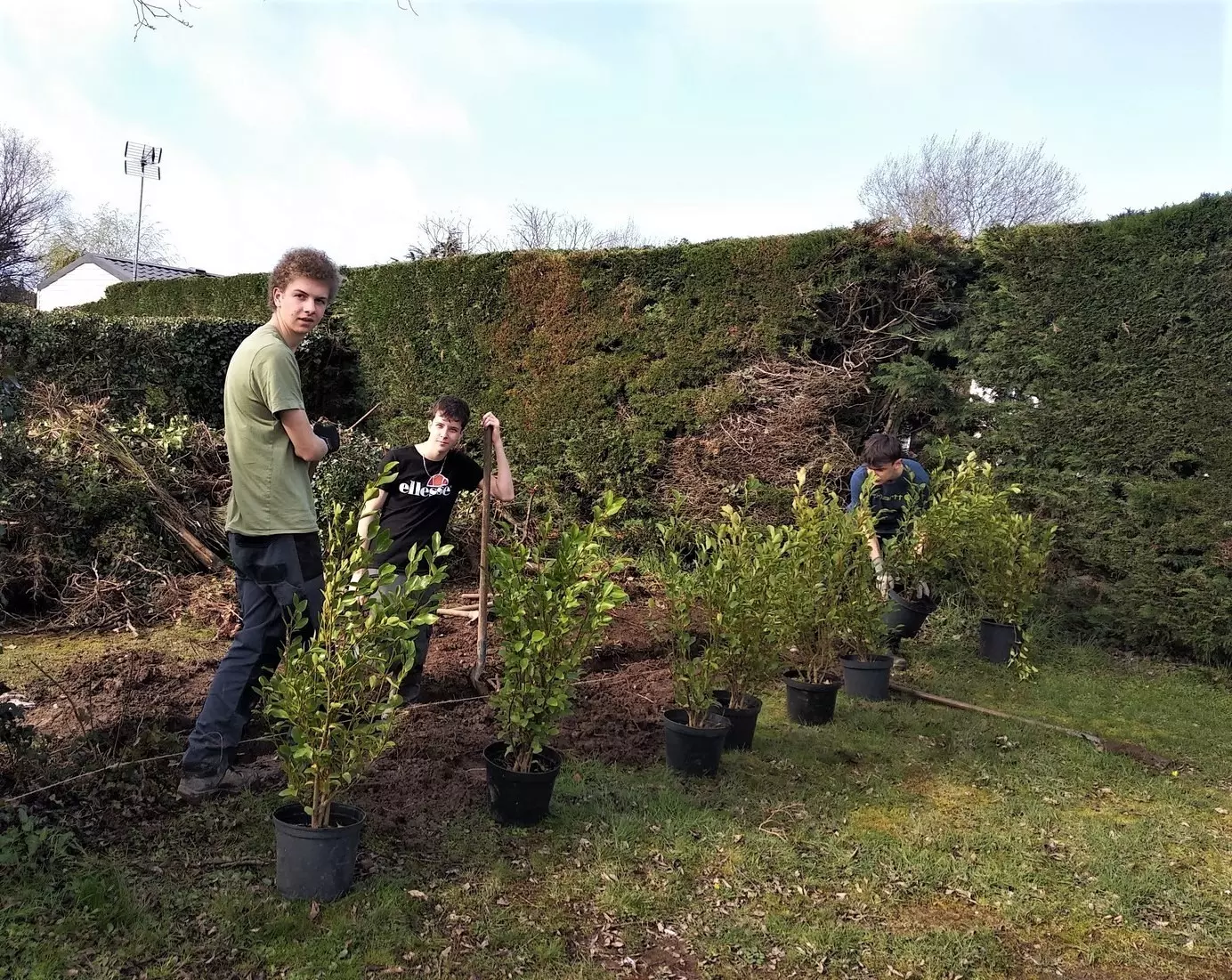 Il s’agit de la première phase de renouvellement des anciennes haies qui séparent et isolent visuellement les parcelles des campeurs. Les 2nde ont expérimenté la plantation de 70 arbustes (Phyllirea angustifolia, Laurus lusitanica, Griselinia littoralis …) dans le respect des règles de l’art : pose de cordeau, préparation des fosses, habillage des racines…