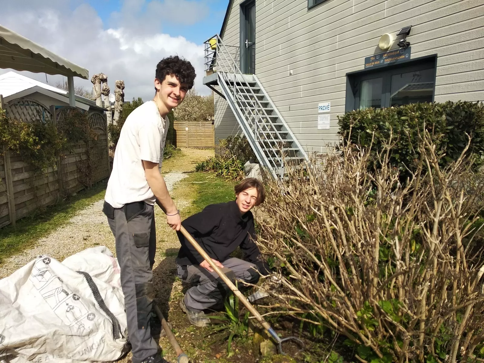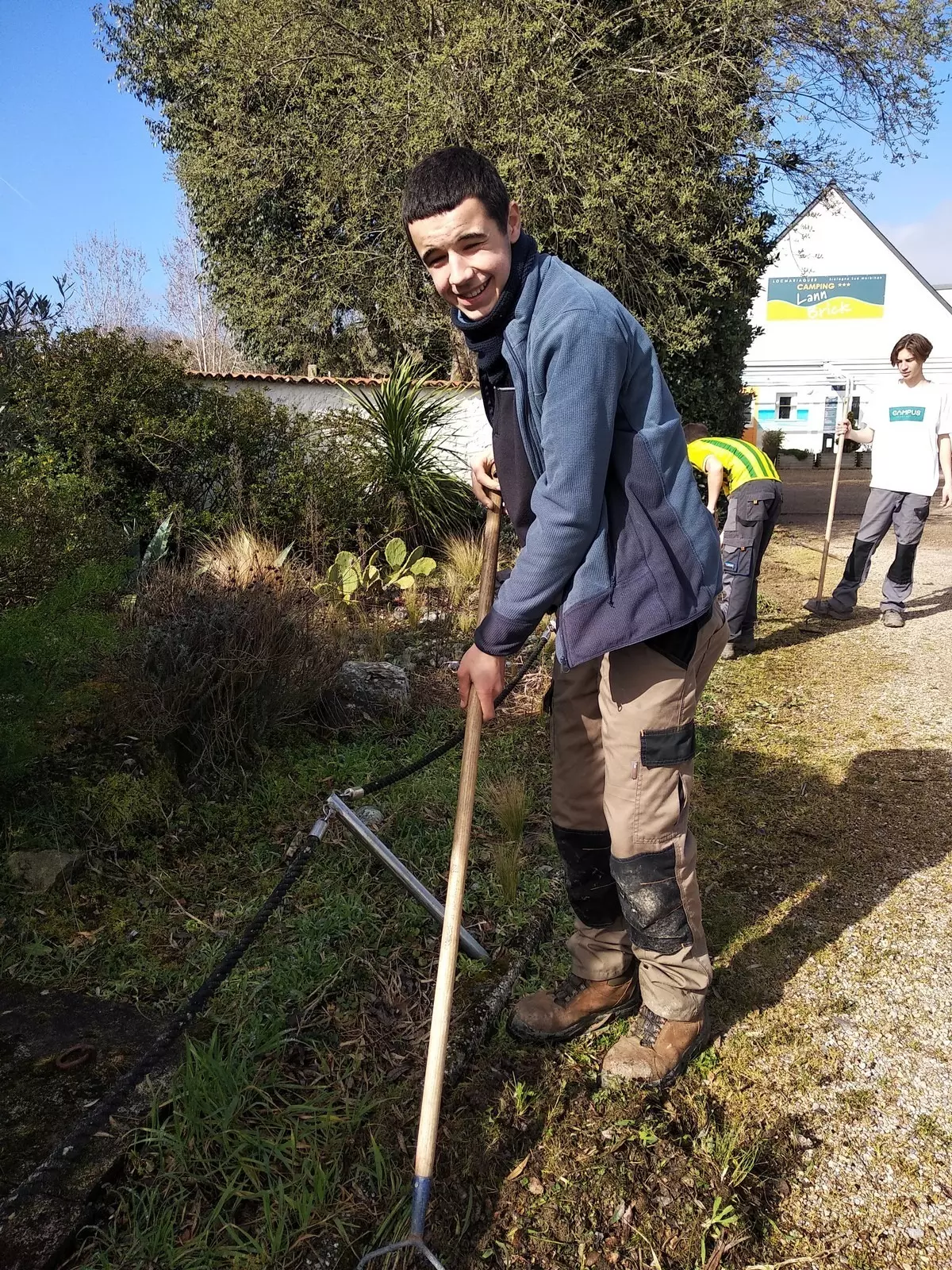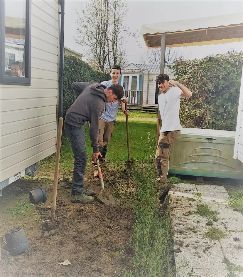 Pour cette deuxième journée de chantier dans le cadre de l’EIE : direction le camping de Maud et Maxime à Locmariaquer, le LANN BRICK, pour un petit ‘’nettoyage de printemps végétal’’ !