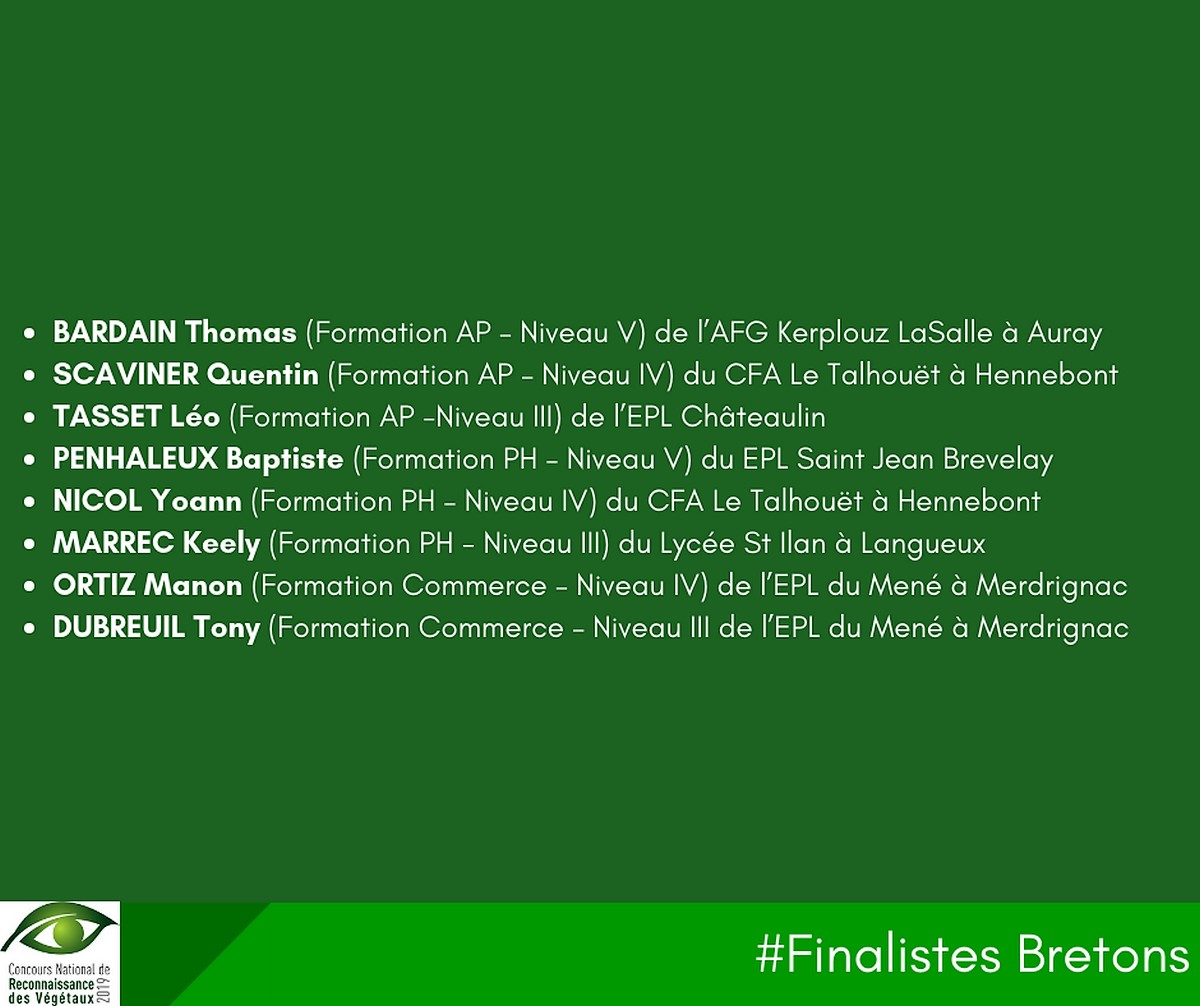 La compétition régionale de Bretagne avait eu lieu cette année le 4 avril 2019 au Lycée de Kerplouz .Elle a connu un véritable succès avec 140 jeunes apprenants, qui ont tenté leur chance dans les épreuves de reconnaissance des végétaux. Au terme de ces 3 mois de compétitions régionales, 73 jeunes se sont qualifiés pour la Finale du Concours National de Reconnaissance des Végétaux.