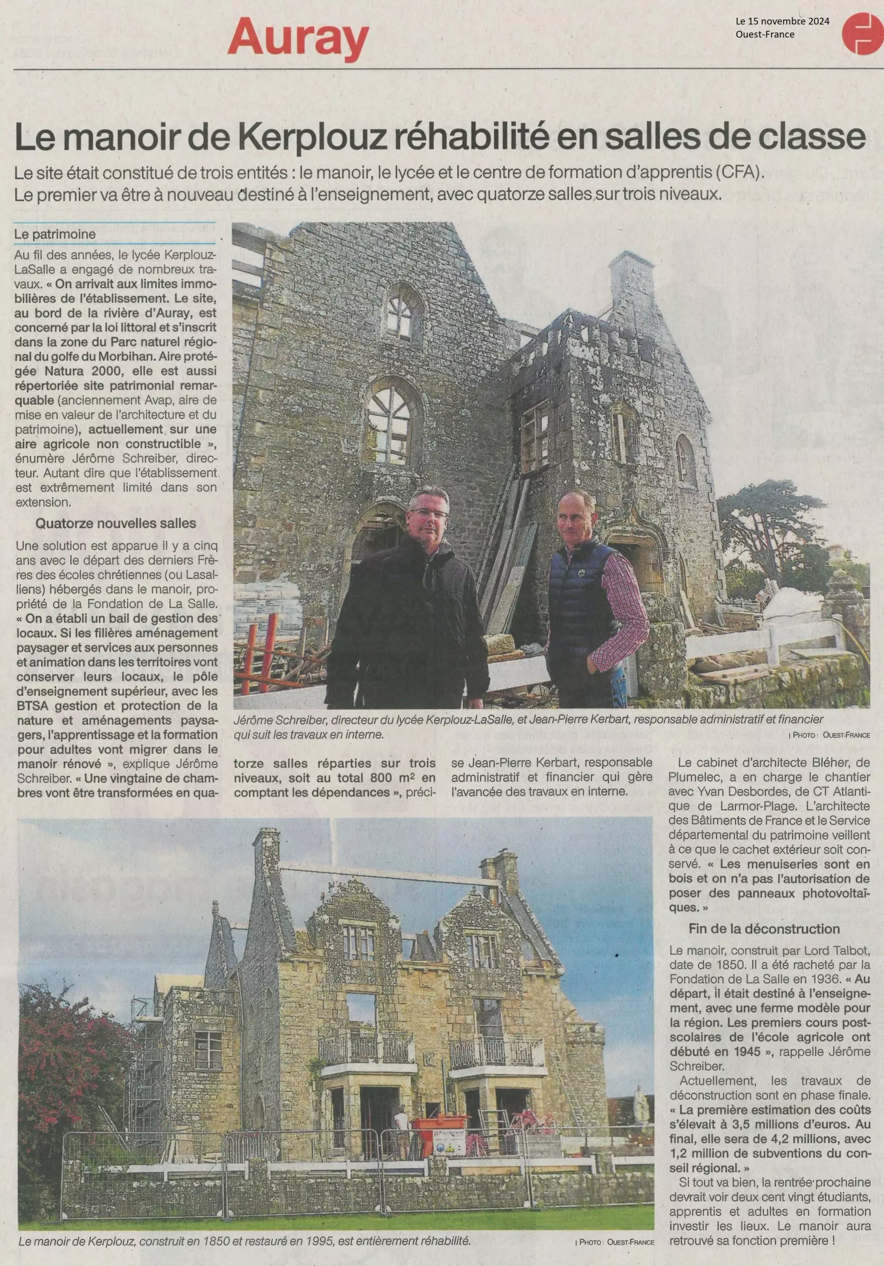 Le manoir de Kerplouz réhabilité en salles de classe par CDI | 15 Nov 2024 | A Kerplouz …, La presse en parle | 0 commentaires Poster le commentaire Annuler la réponseVotre adresse e-mail ne sera pas publiée. Les champs obligatoires sont indiqués avec *Commentaire * Nom * E-mail * Site web Δ Ce site utilise Akismet pour réduire les indésirables. En savoir plus sur la façon dont les données de vos commentaires sont traitées.
