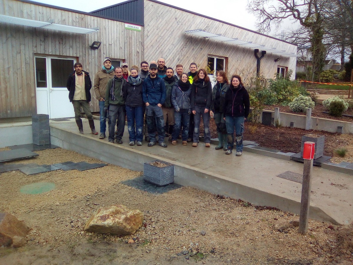 En 2017, Bruno Le Roux, avec le groupe des apprentis adultes, avait commencé la réalisation d’une place à la sortie des vestiaires nouvellement construits, en mettant en place des chaînettes de petits « pavés » de luzerna grise sciée (10X10), en plantant un Albizia julibrissin ‘Summer Chocolate’ en position centrale ainsi que des grimpantes sur une main courante mélant bois et panneaux grillagés (récupération des panneaux des anciens vestiaires). Mais aussi une haie d’Osmanthus aurantiacus.