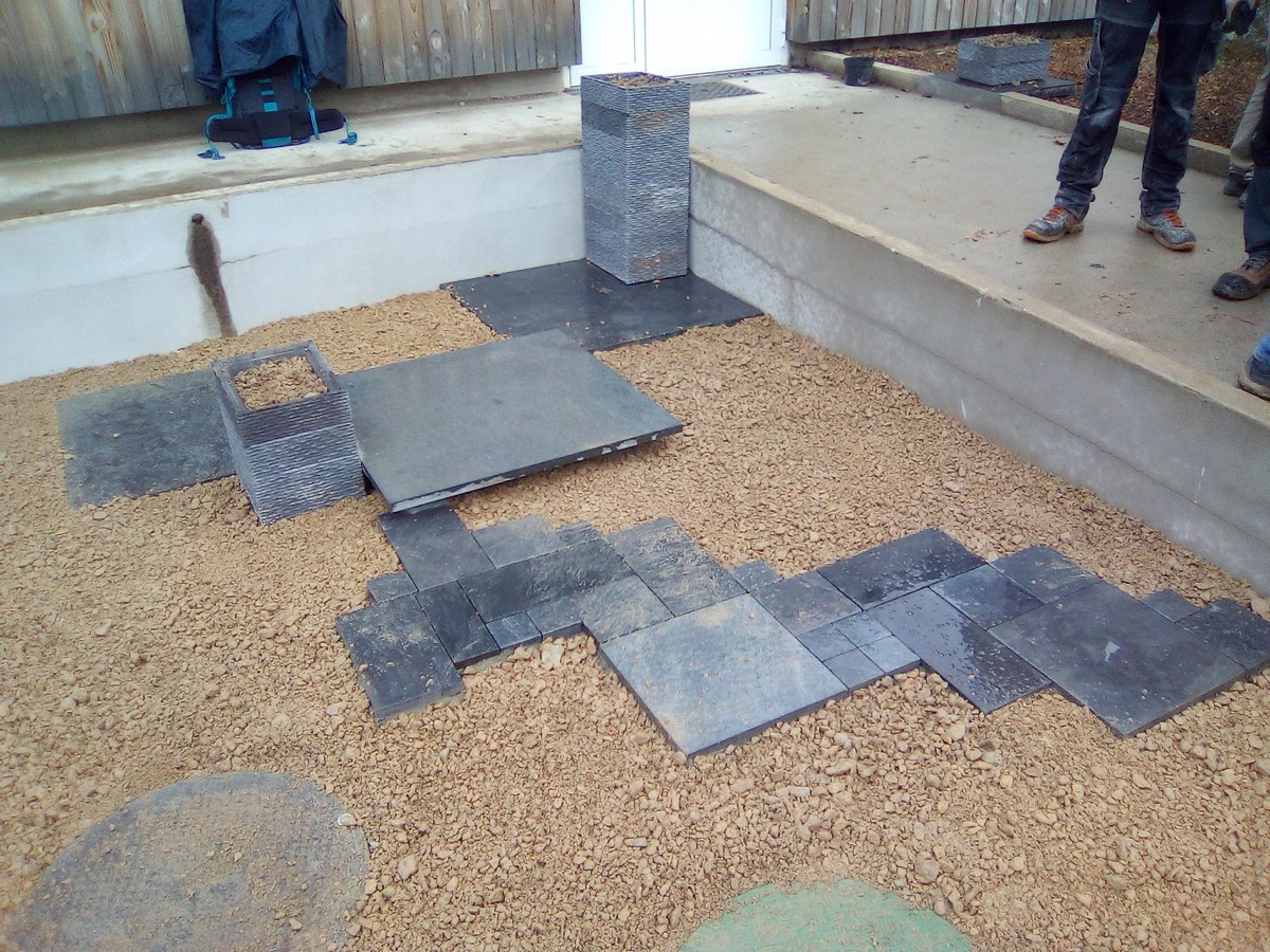 Un autre groupe a utilisé des matériaux récupérés chez Point P lors de la réalisation par les apprentis BP 2ème année du showroom de cette enseigne à Theix. Ces matériaux en petits lots ont permis d’aménager la deuxième rampe de sortie des vestiaires. La pose en bordure de ces matériaux dans les tons gris anthracite et noir (très ou trop à la mode depuis quelques années) a été faite en jouant sur les différences de niveaux et d’épaisseurs de ces matériaux.