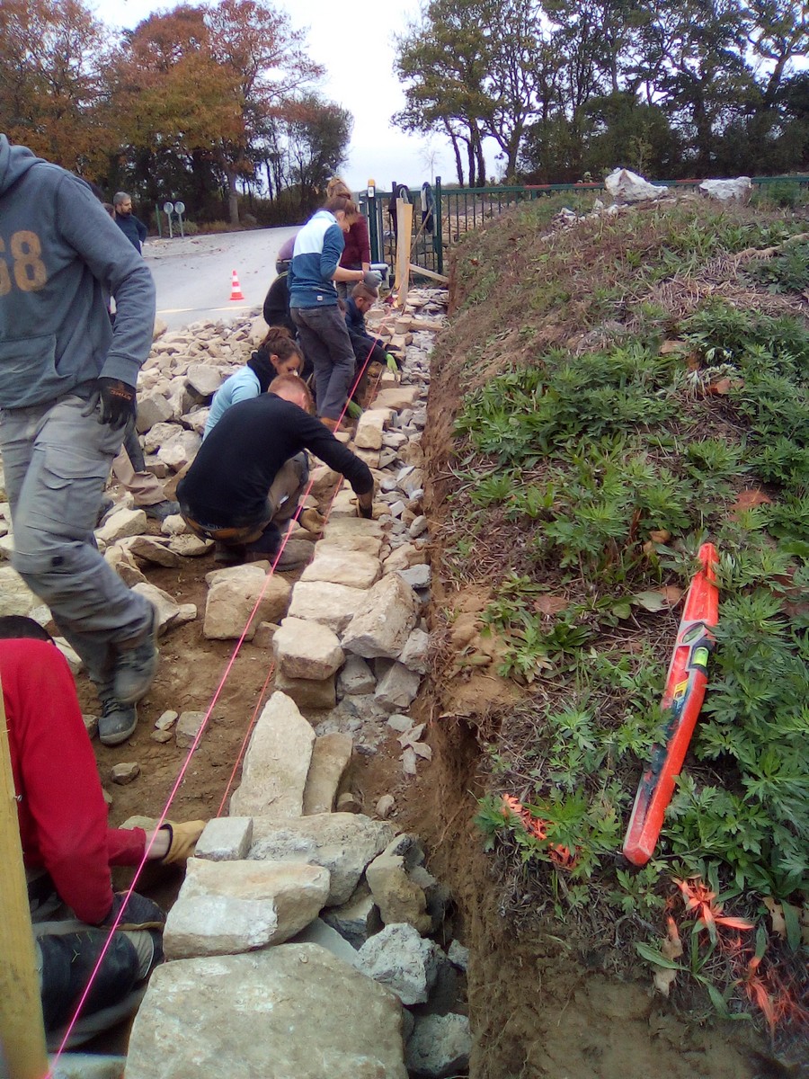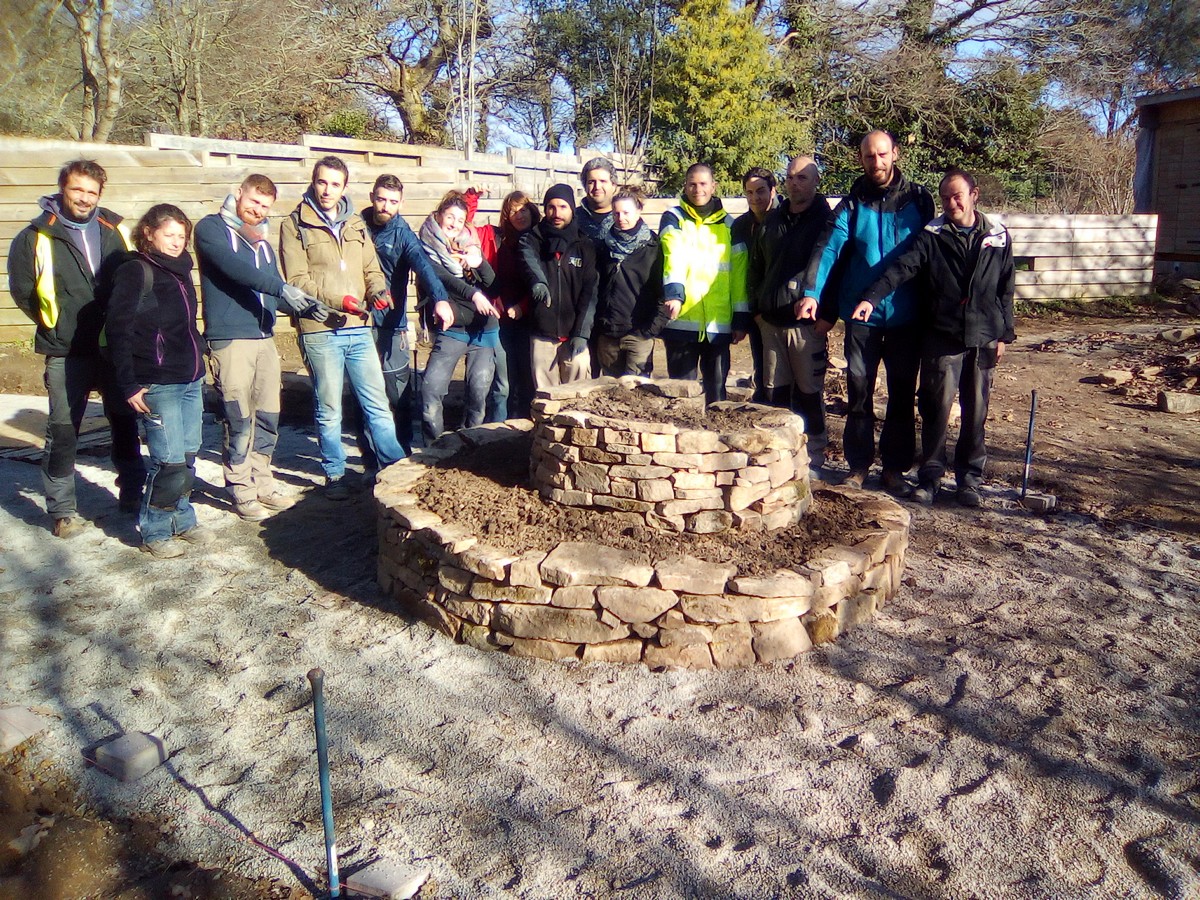 En 2019 le groupe des apprenants adultes dont j’ai la charge a repris ce chantier en application des cours sur la maçonnerie dite horizontale. Nous avons donc fini cette place. L’enthousiasme des apprenants, leur motivation et leur efficacité, m’ont donné des idées et je leur ai proposé de rester quelques temps sur ce lieu à aménager.