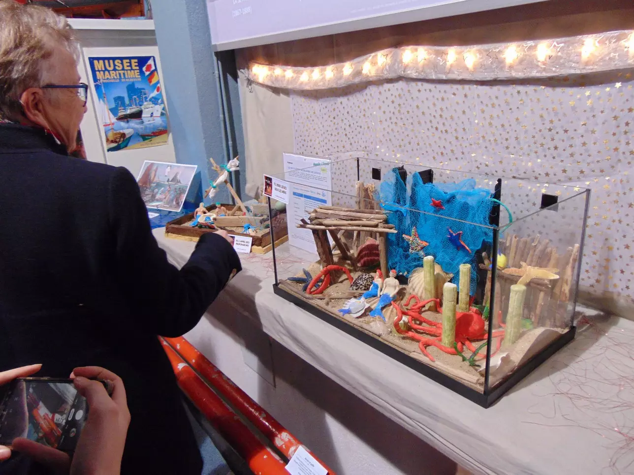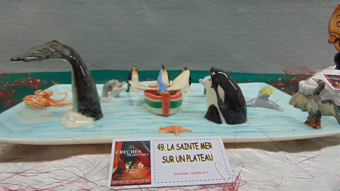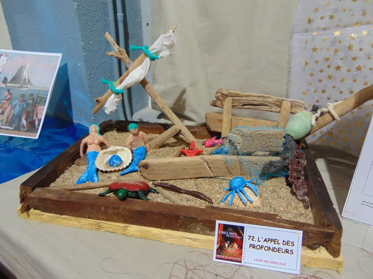 L’évocation de l’écologie et du rôle des laisses de mer se sont traduits par une queue de baleine protectrice en bois flotté protégeant une nativité stylisée. Les 2 autres projets ont davantage évoqué les contes et légendes par la réalisation de nativités avec des sirènes et animaux marins. Ils ont été réalisés en pâte de modelage durcissante peinte, agrémentée de coquillages et d’éléments de décor.