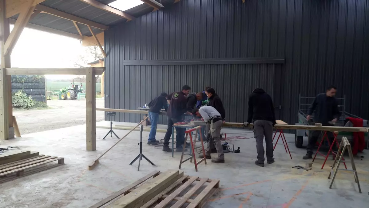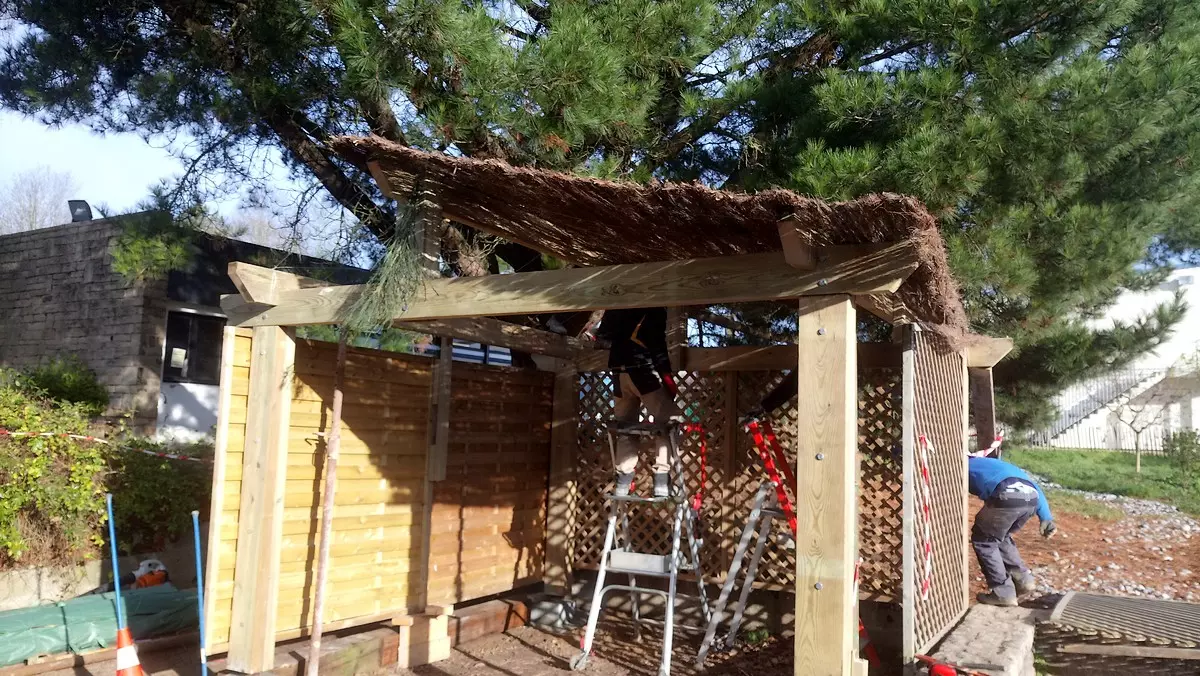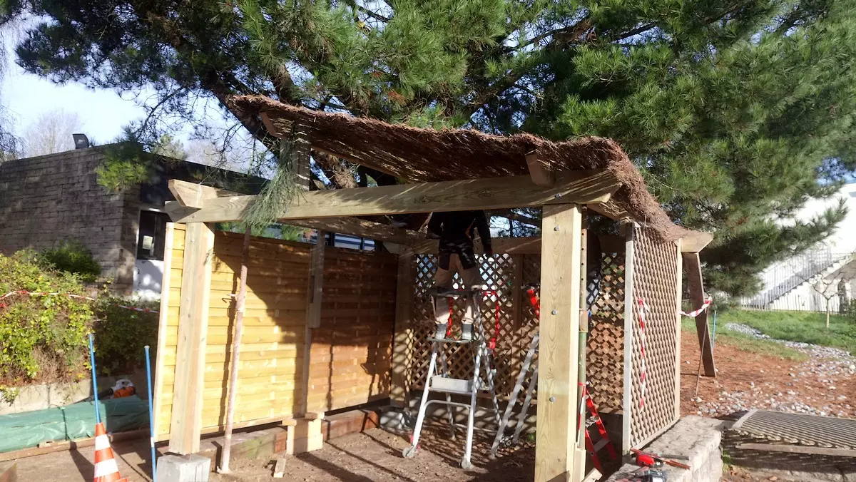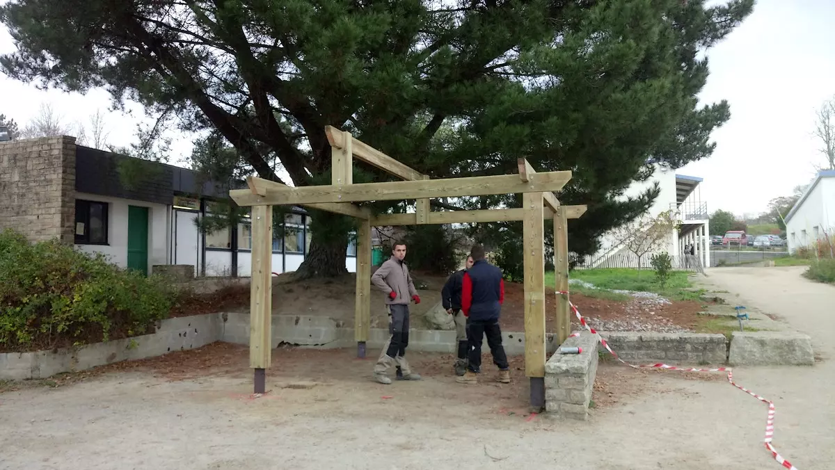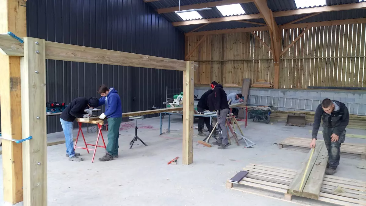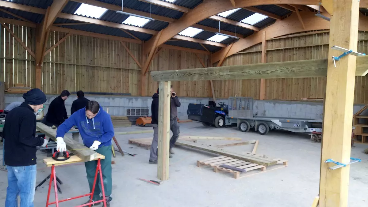 Le travail en menuiserie paysagère consistait à réaliser une ossature complète intégrant une charpente assemblée en bastaings bruts de section 8*20. Les qualités et capacités professionnelles visées par ce module de formation sont les métrés, la planification, la dextérité manuelle, l’ajustage et l’assemblage des pièces de bois.