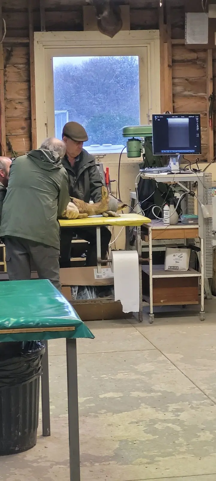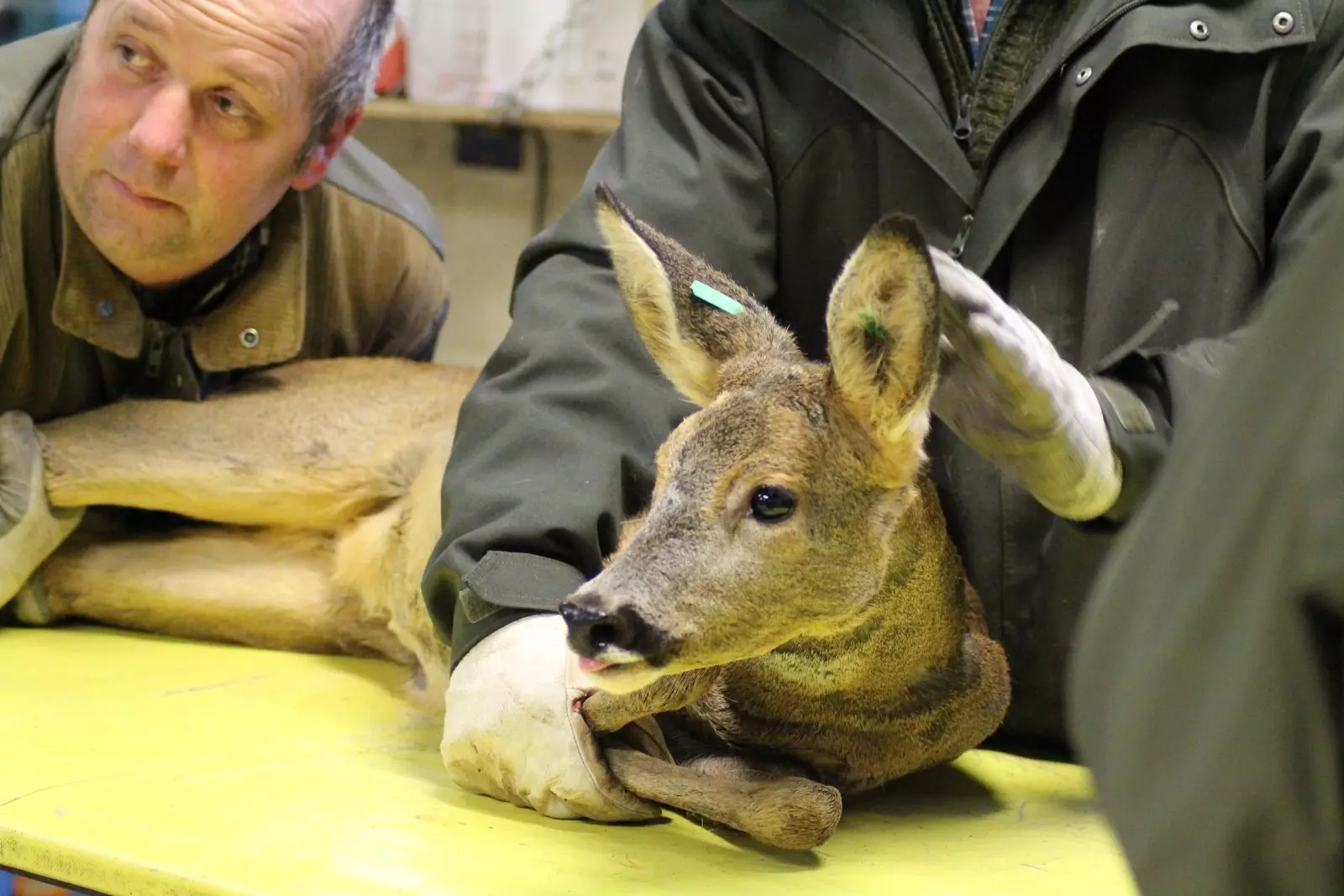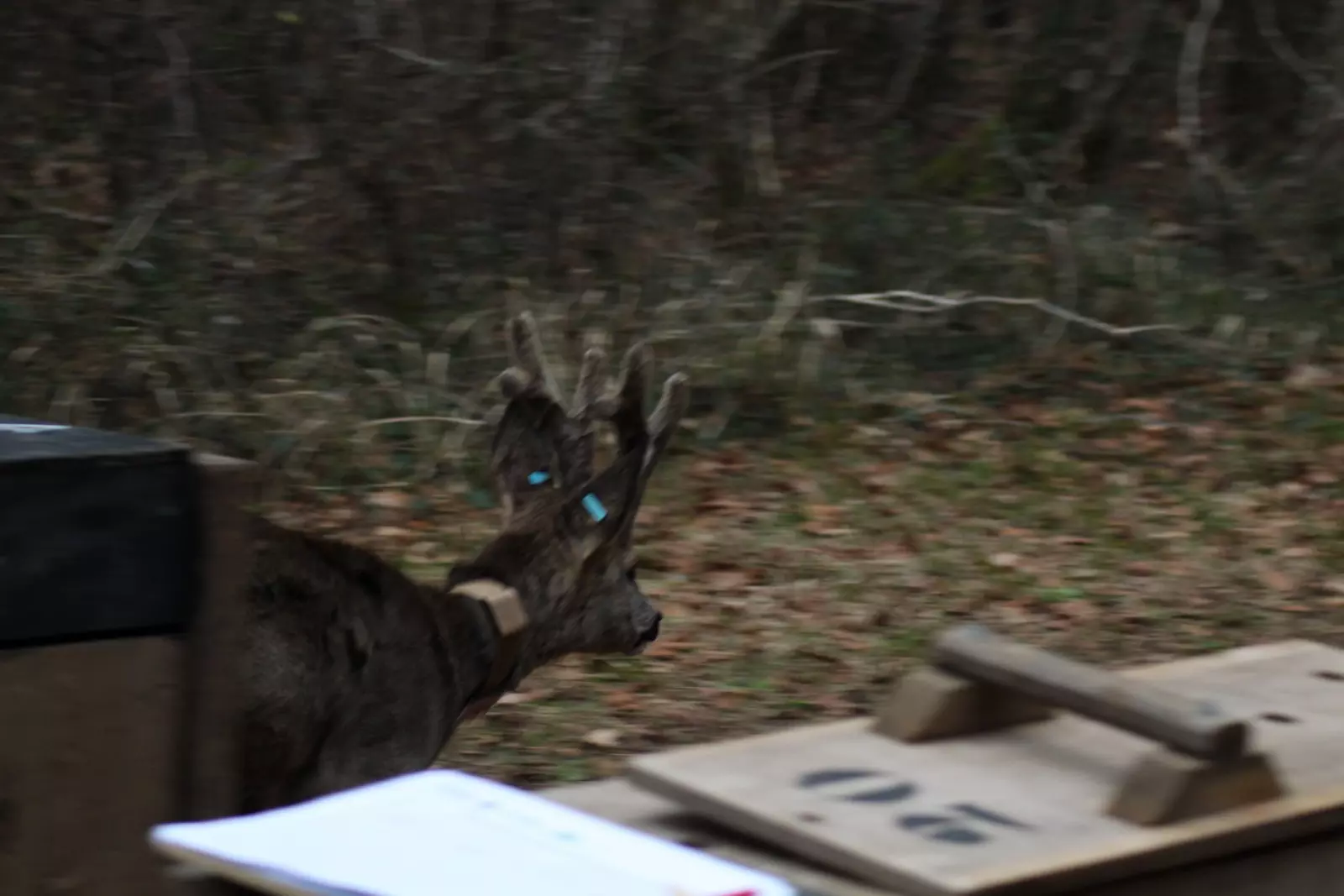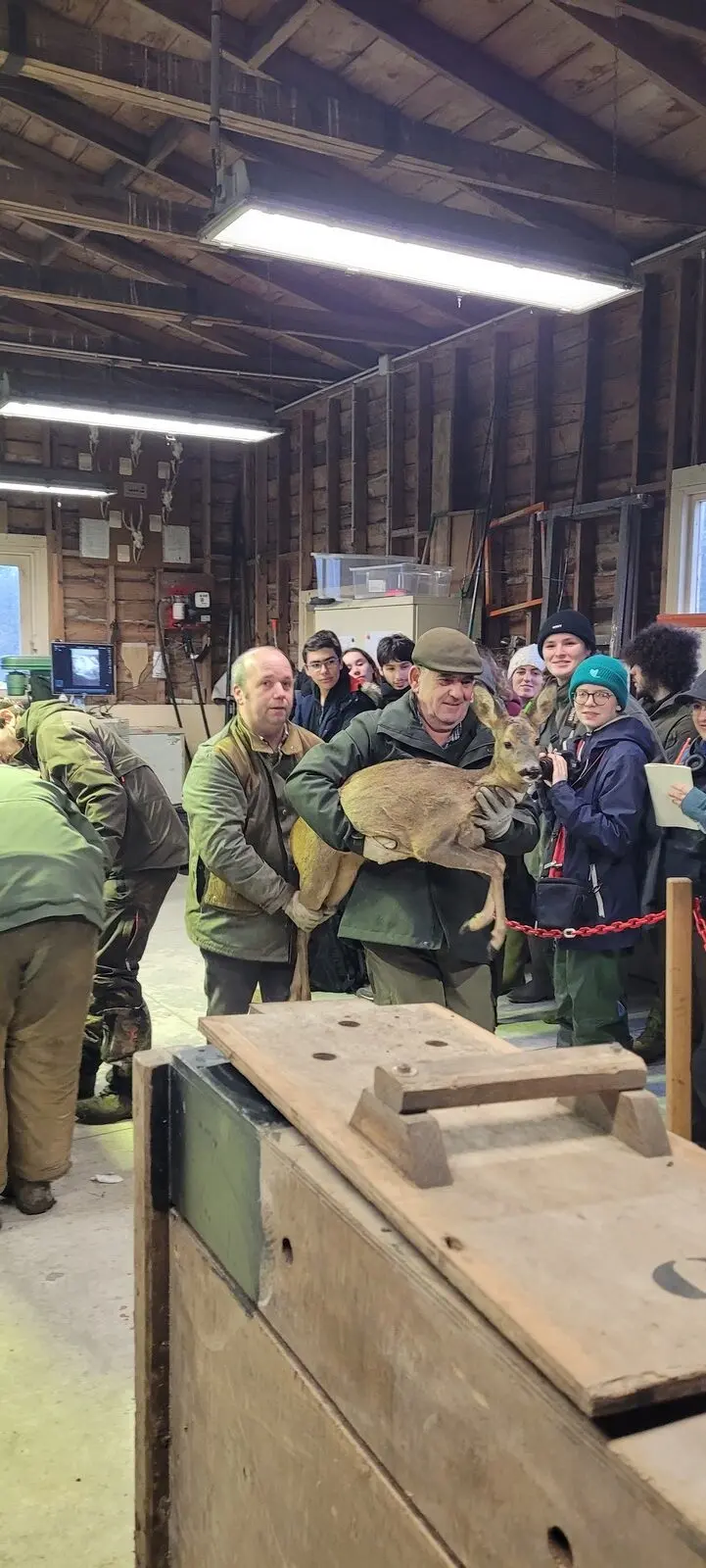 Dès la descente du car, direction la forêt pour participer à une capture de chevreuils. Une parcelle de 30 à 50 hectares est entourée de filets. Les chevreuils, poussés par des chiens, viennent s’y prendre. Ils sont alors capturés, marqués, des mesures sont effectuées (estimation de l’âge, taille, stress, échographie pour les femelles…). Ces données contribuent à une étude menée depuis 50 ans sur la dynamique de la population (état de santé des animaux en fonction de la disponibilité alimentaire dans la réserve, directement liée à l’état de la forêt). Ce protocole a questionné de nombreux étudiants, sensibles au stress généré par la méthode de capture (nous avons capturé 8 chevreuils et un sanglier).