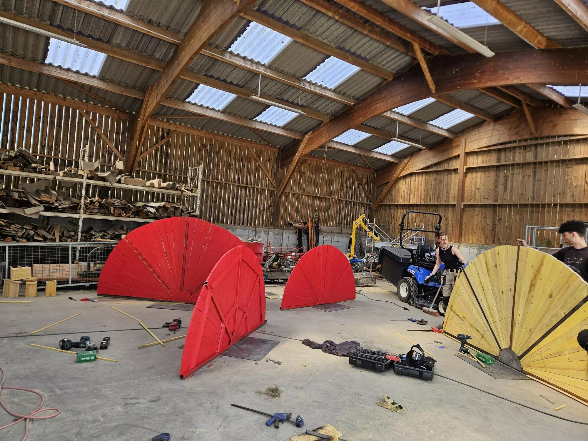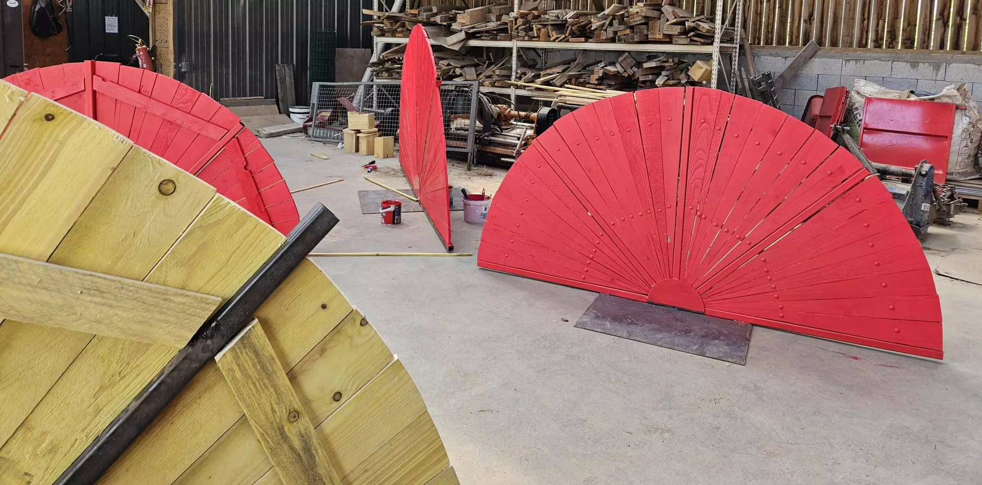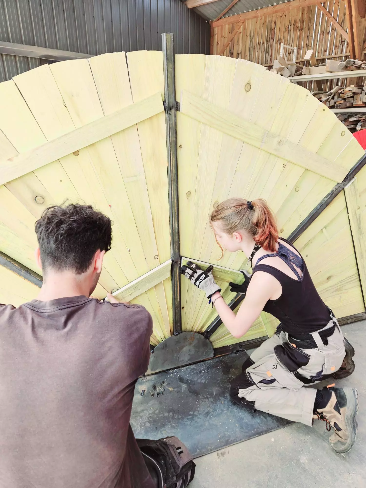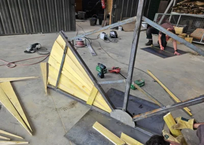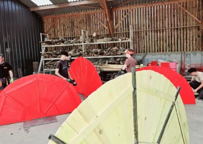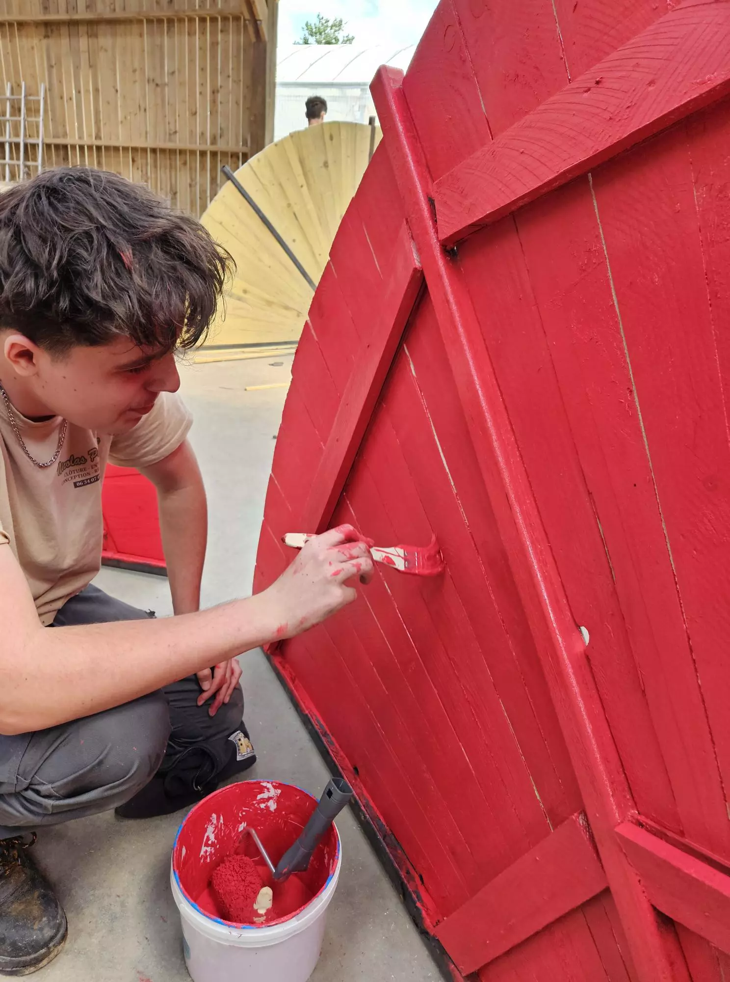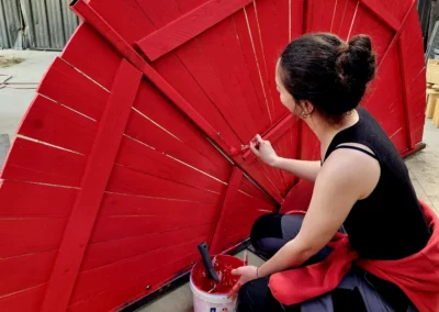 Ainsi, les BTS AP2 ont passé deux journées à préparer les ossatures métalliques, découper en biseau les lames de voliges et peindre en rouge. Du rouge mais pas n’importe quel rouge, un beau rouge coquelicot intense et frais comme le vent qui arrive du pays du soleil levant.