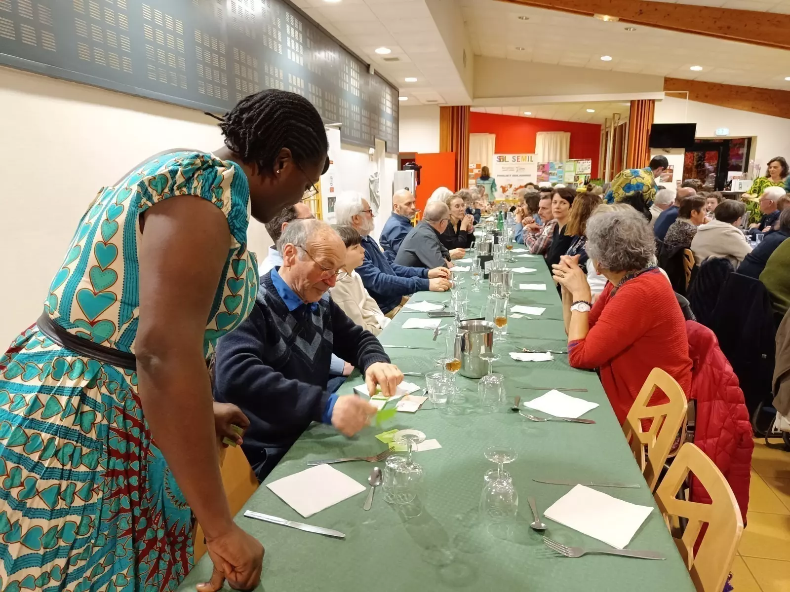 Au programme de cette soirée Couscous : un accueil rythmé par de la musique africaine, le service d’un apéritif afin de favoriser les liens, un copieux et très apprécié couscous suivi d’un dessert gourmand (assortiment de gâteaux avec sa boisson chaude), quelques animations dont une tombola avec 3 heureux gagnants (un panier garni, un trio de bouteilles accompagné de son orchidée, un duo de bouteilles et son tablier), le tout assuré par des serveurs et animateurs bénévoles en tenue africaine bien colorée !