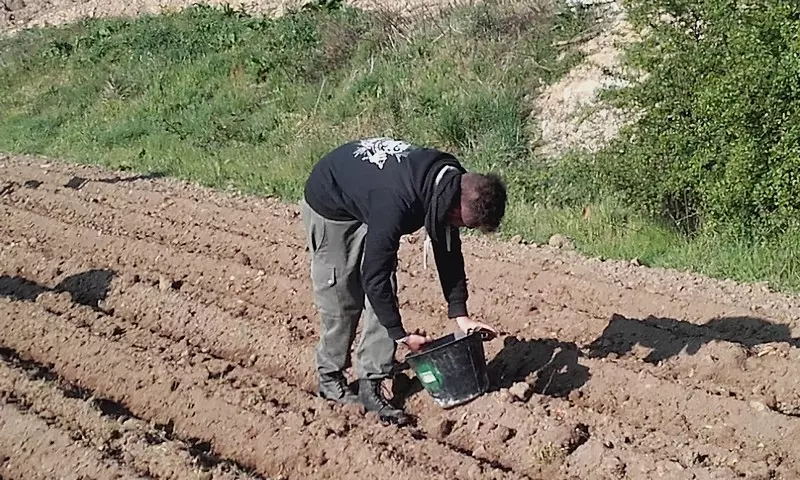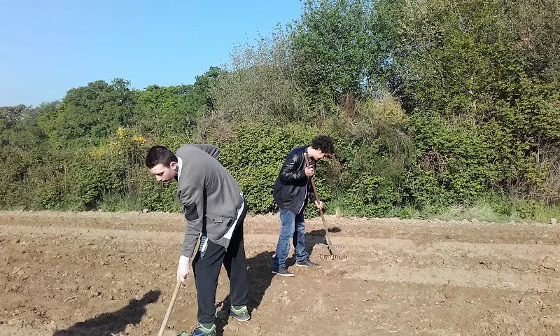 Nous avons également pu compter sur un voisin, ancien de Kerplouz, Mr Le Labousse, qui nous a aidé en traçant les sillons. Puis, les élèves, avec enthousiasme, se sont relayés pour planter et recouvrir les plants.