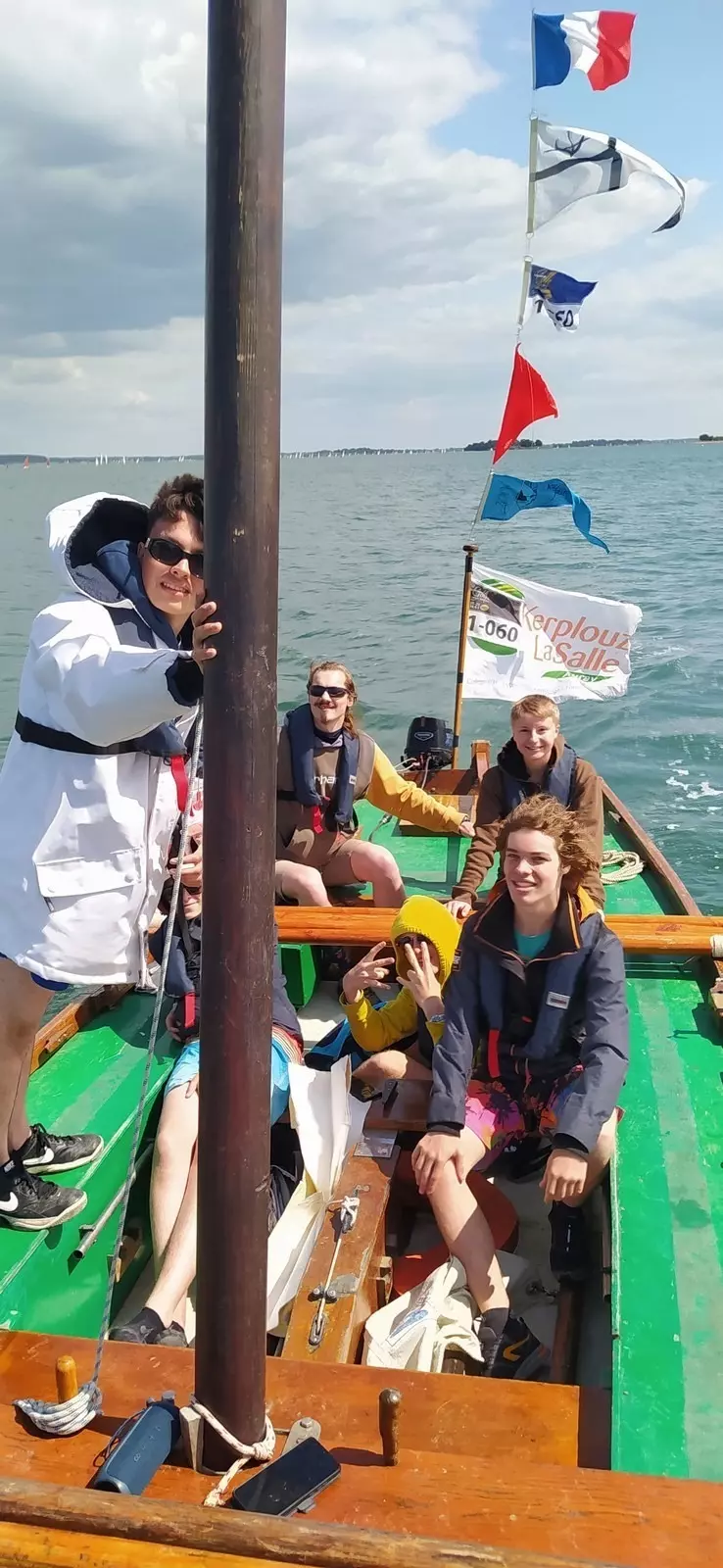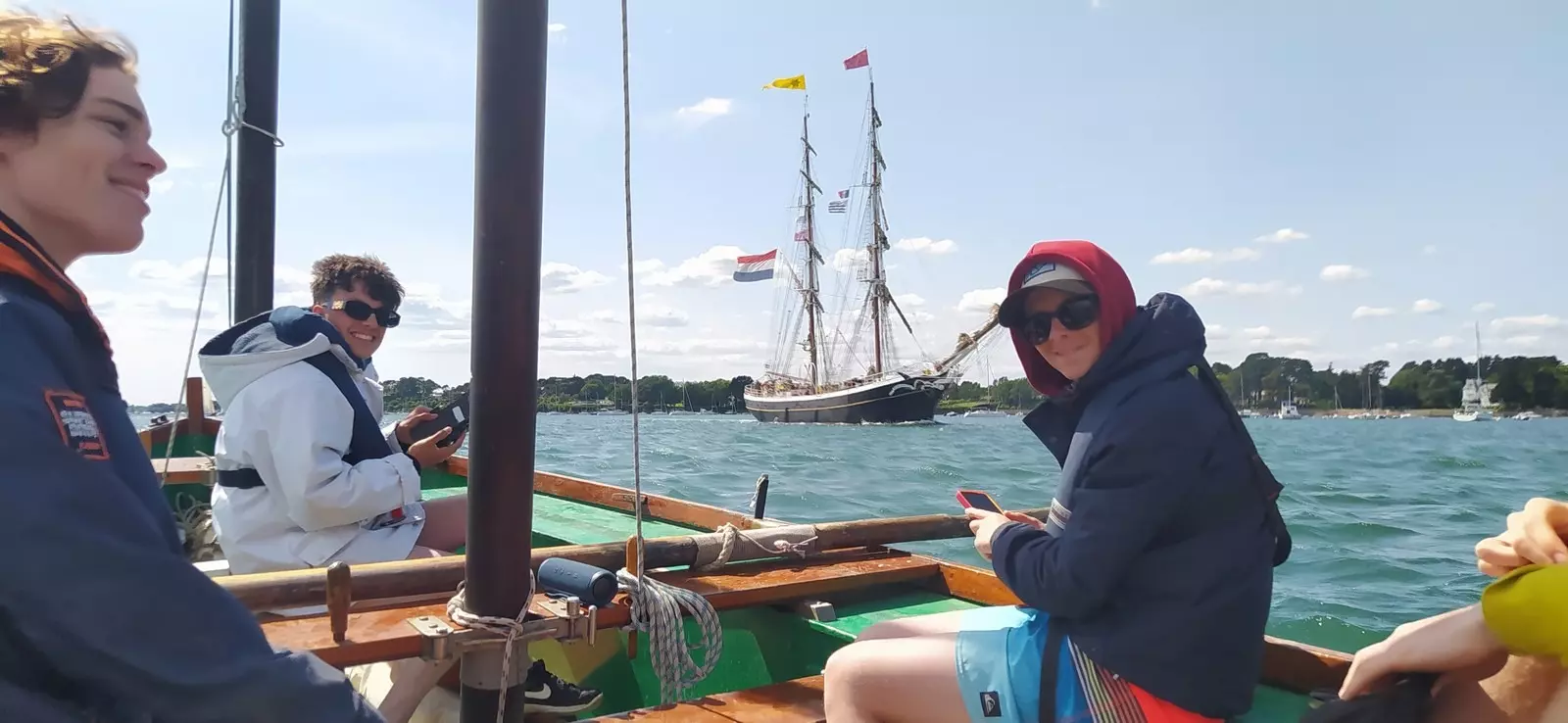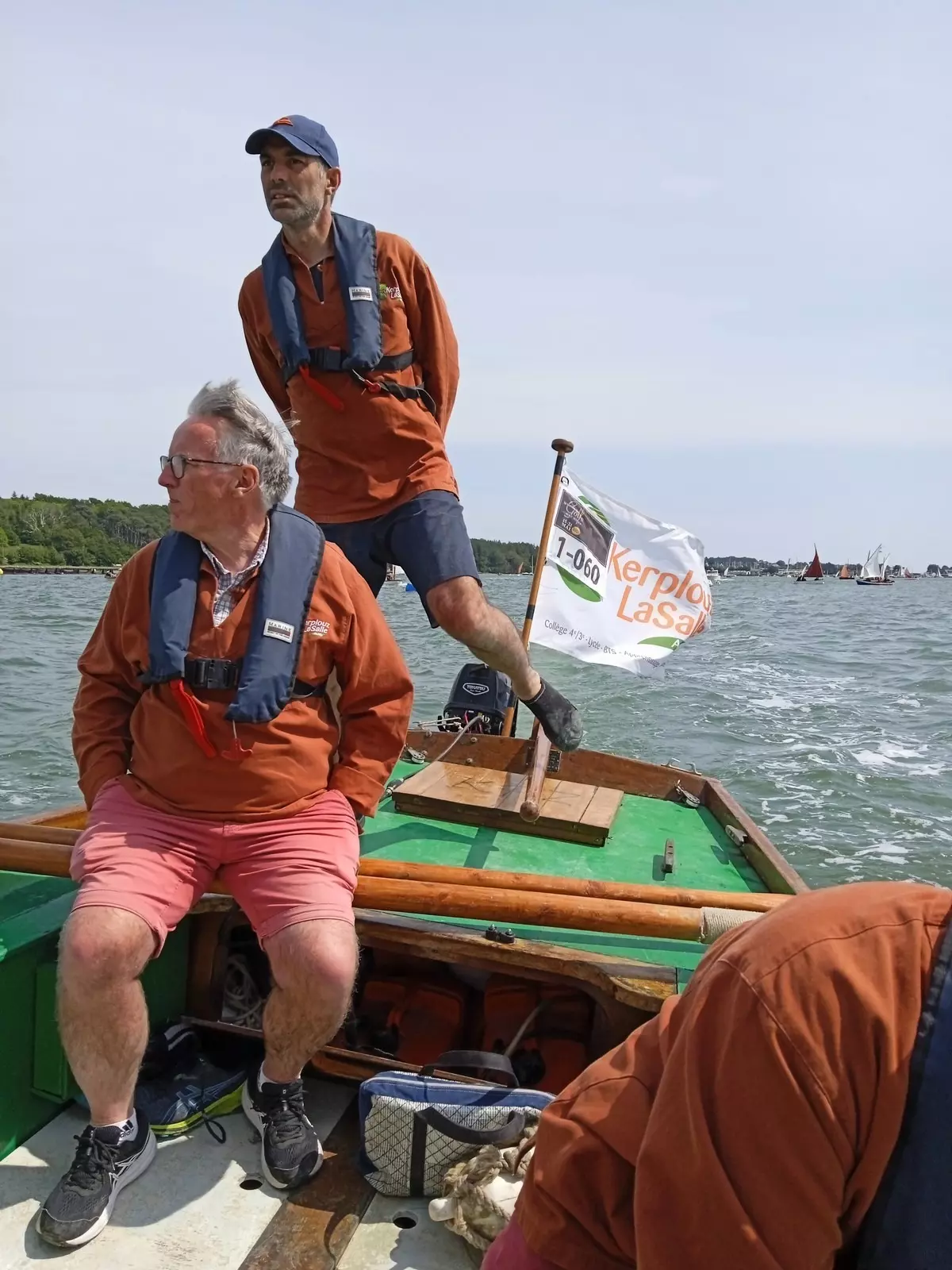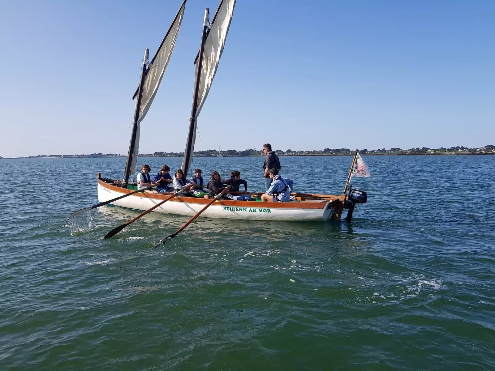 Le mercredi débute la navigation en famille avec notre flottille n°1. Et quoi de mieux que nos « vieux loups de mers » pour prendre possession de notre belle endormie pendant quatre années sous taud au lycée. Joël, Jean, Henri et leurs proches sont tous heureux de retrouver « l’étoile de la mer » et lui faire faire le tour d’Izenah, la perle du golfe. Notre yole Morbihan fut construite dans les années 2000 par ces mêmes personnes avec le concours de nos élèves collégiens de l’époque, dans le cadre d’un projet national en direction de la jeunesse afin de transmettre l’esprit d’équipage et le sens marin. Ce voile-aviron, particulièrement adapté à l’apprentissage maritime, est une version « light » des yoles 1796 aussi appelées yoles de Bantry. Elles sont des répliques de la yole de la frégate La Résolue, partie soutenir les patriotes irlandais en lutte contre l’Angleterre dans la baie de Bantry.