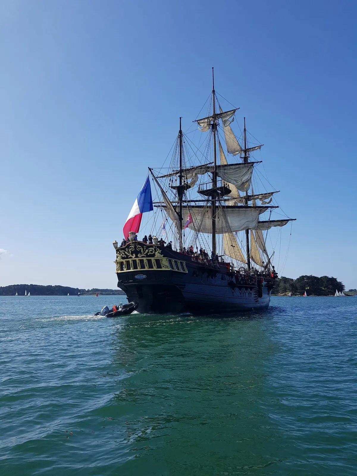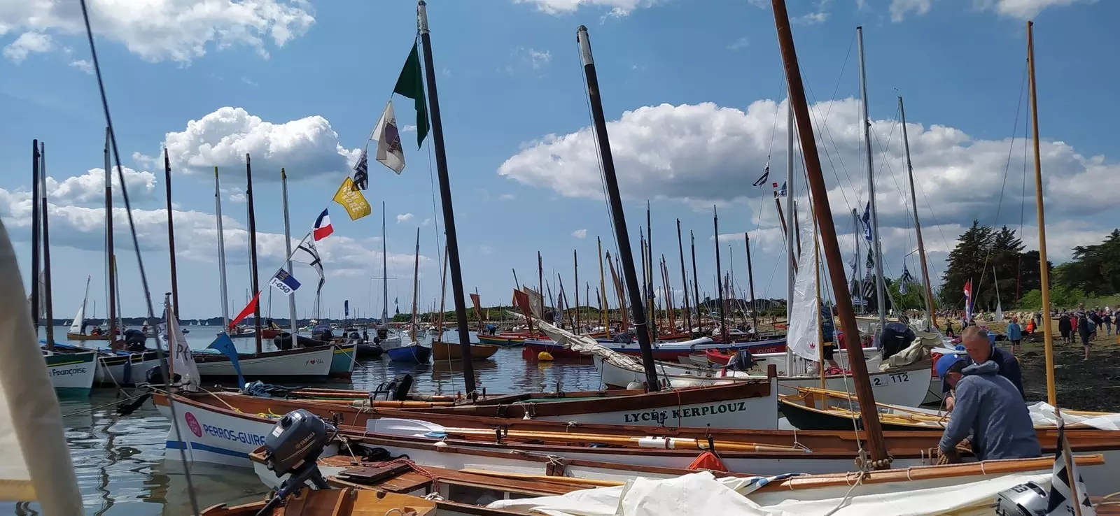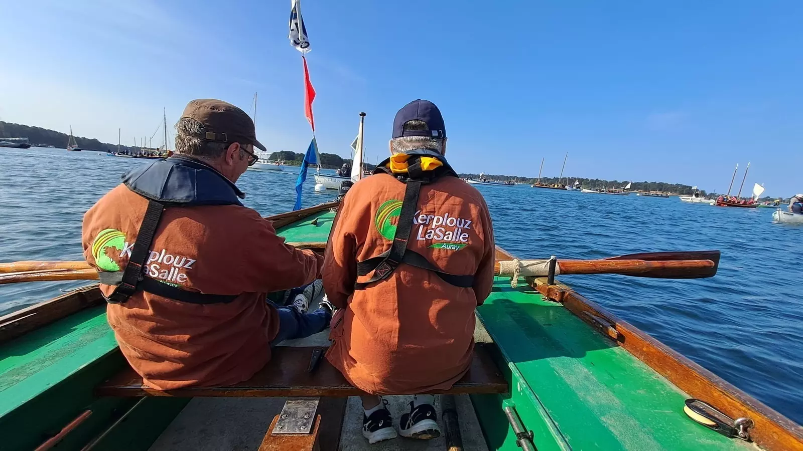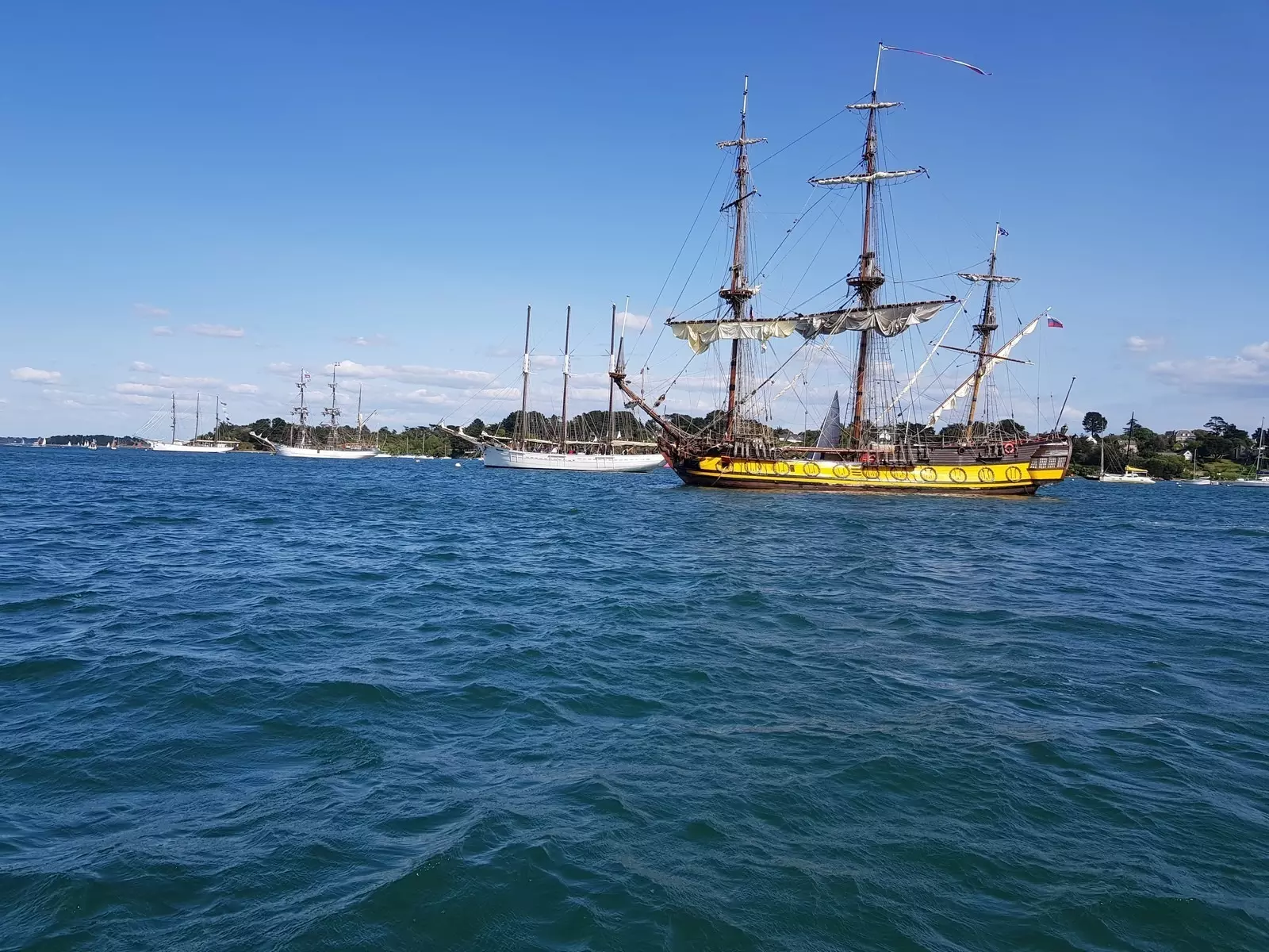 Par courant de jusant, avec un vent de noroit 2 à 3 beaufort, toutes voiles dehors, nous sortons du golfe dans la matinée pour aller déjeuner sur la pointe de Kerpenhir et attendre patiemment le départ de la parade d’ouverture. Vers 14H30, nous pénétrons lentement à l’aviron dans la petite mer dans le cadre d’un ballet orchestré avec précision par l’organisation et au milieu des légendaires trois mâts. Le retour à bon port se fera au moteur et avec de larges sourires sur les visages.