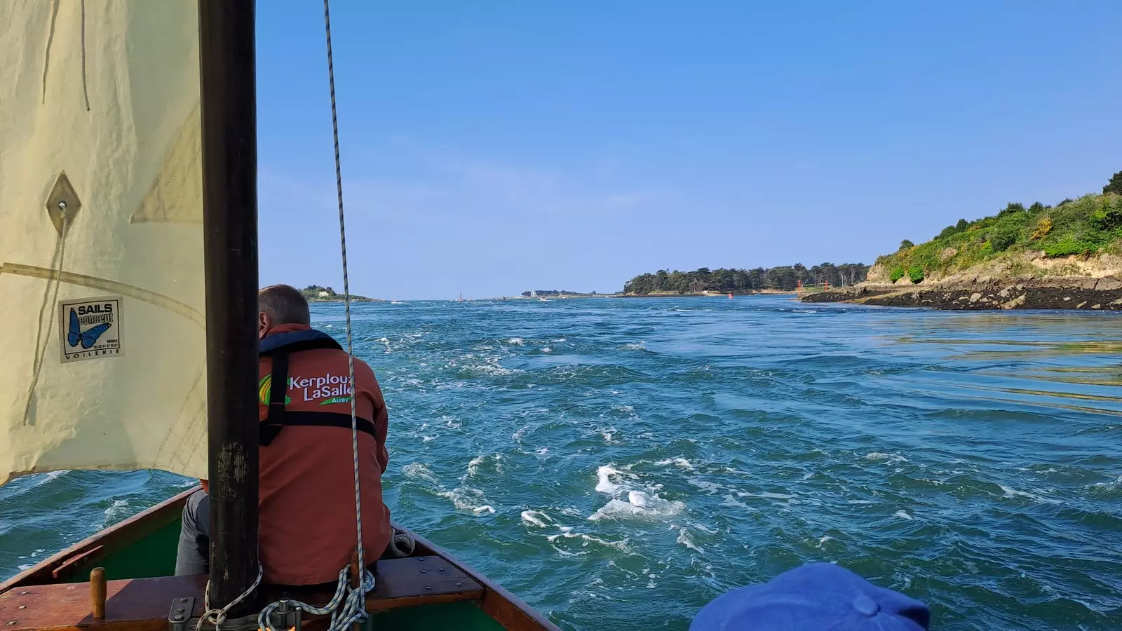 Le retour à bon port se fera sous l’œil des terriens venus nous accueillir devant Kerplouz. Admiratifs, ils regardent arriver le bateau par une belle manœuvre qui inspire le respect. Affalant tranquillement la grand-voile, le bateau accoste au ponton et au travers de simples gestes, on peut percevoir la fierté discrète et naturelle du marin qui ramène le bateau à bon port.