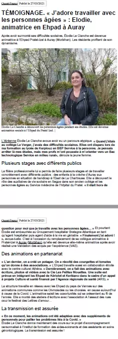 Témoignage. « J’adore travailler avec les personnes âgées » : Elodie, animatrice en Ehpad à Auray par CDI | 27 Mar 2021 | Bac. Pro. Services Aux Personnes et Animation dans les Territoires, La presse en parle | 0 commentaires Poster le commentaire Annuler la réponseVotre adresse e-mail ne sera pas publiée. Les champs obligatoires sont indiqués avec *Commentaire * Nom * E-mail * Site web Δ Ce site utilise Akismet pour réduire les indésirables. En savoir plus sur la façon dont les données de vos commentaires sont traitées.