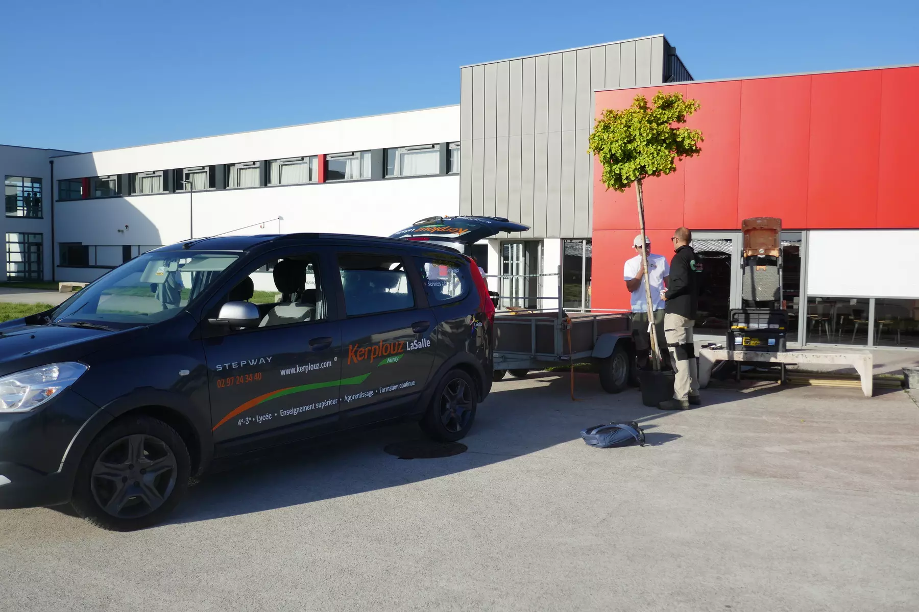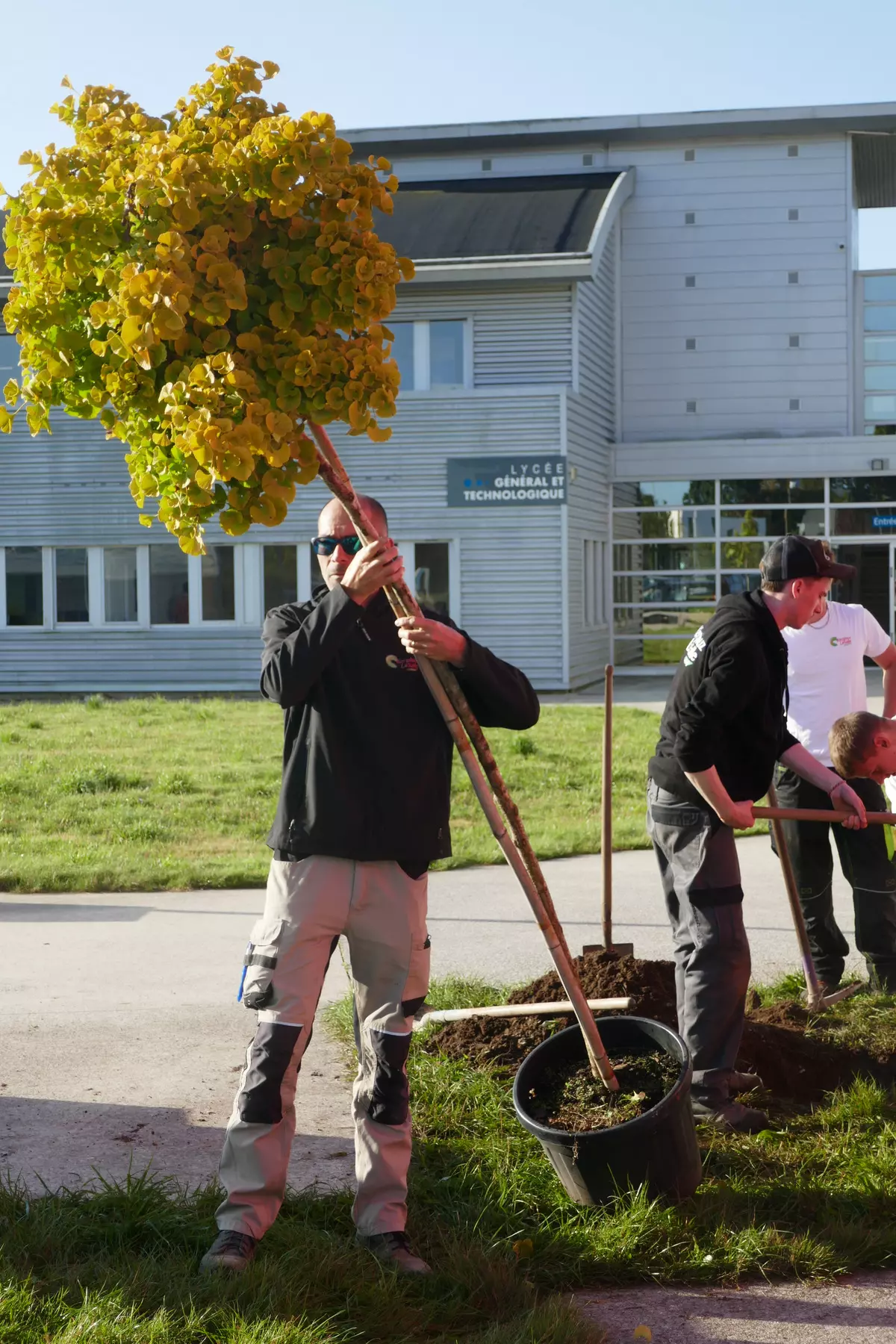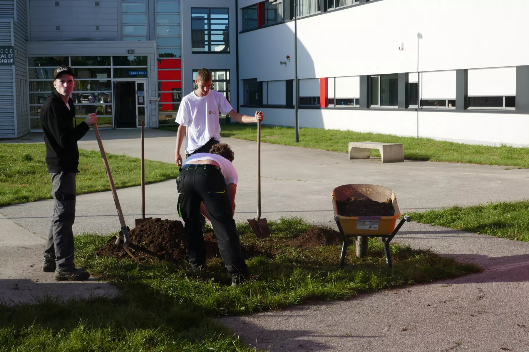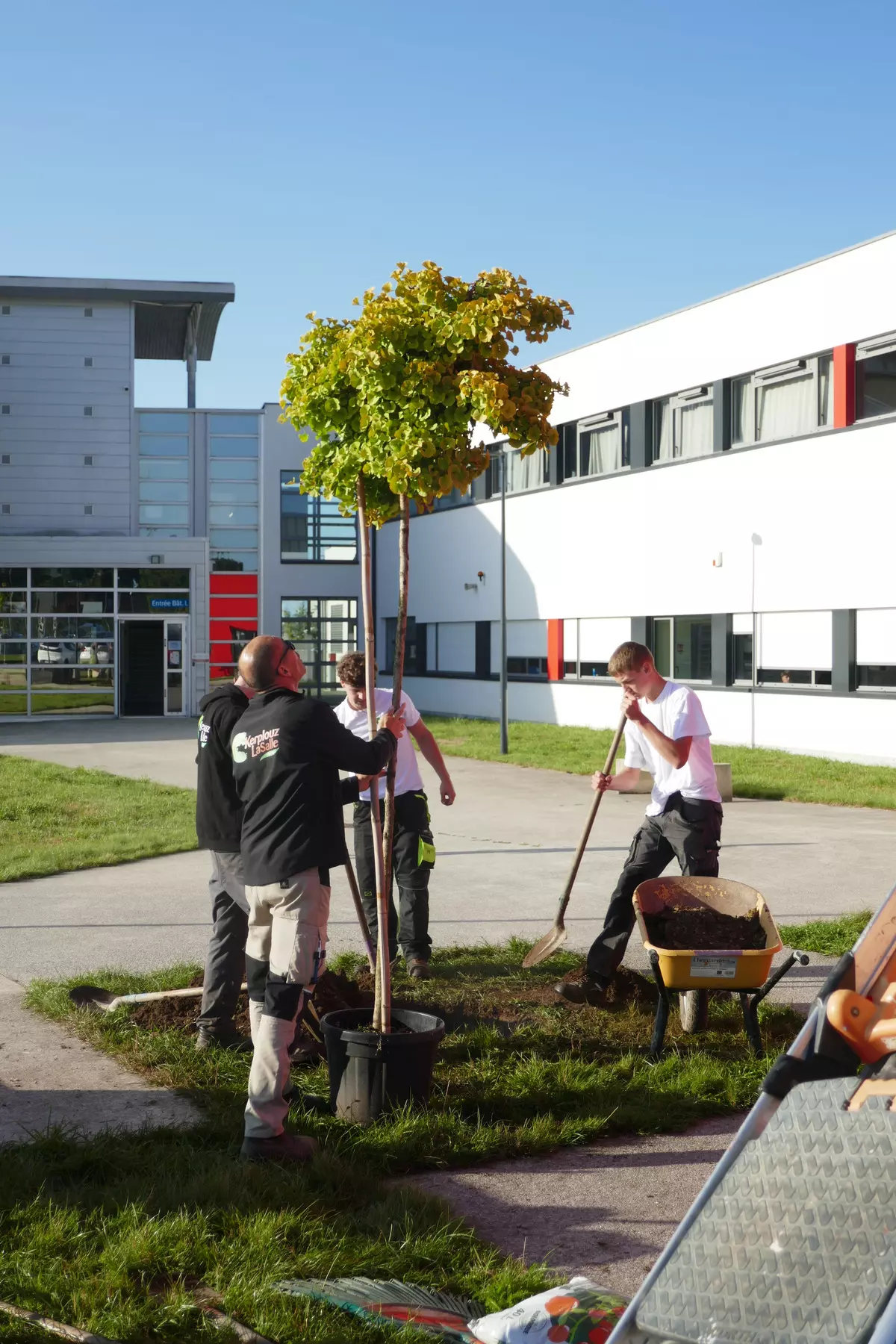 À la demande du Lycée St Joseph de Vannes, afin de rendre hommage à un jeune tragiquement disparu cet été, 4 élèves en terminale bac professionnel Aménagements Paysagers ont réalisé la plantation d’un Ginkgo biloba ‘Mariken’. Cette variété au développement beaucoup plus lent et au port plus compact que l’espèce type est tout à fait adaptée aux contraintes du site. Un tuteurage en tripode a été nécessaire pour maintenir l’arbre sur ses premières années en attendant qu’il s’ancre et se familiarise avec son nouveau milieu.