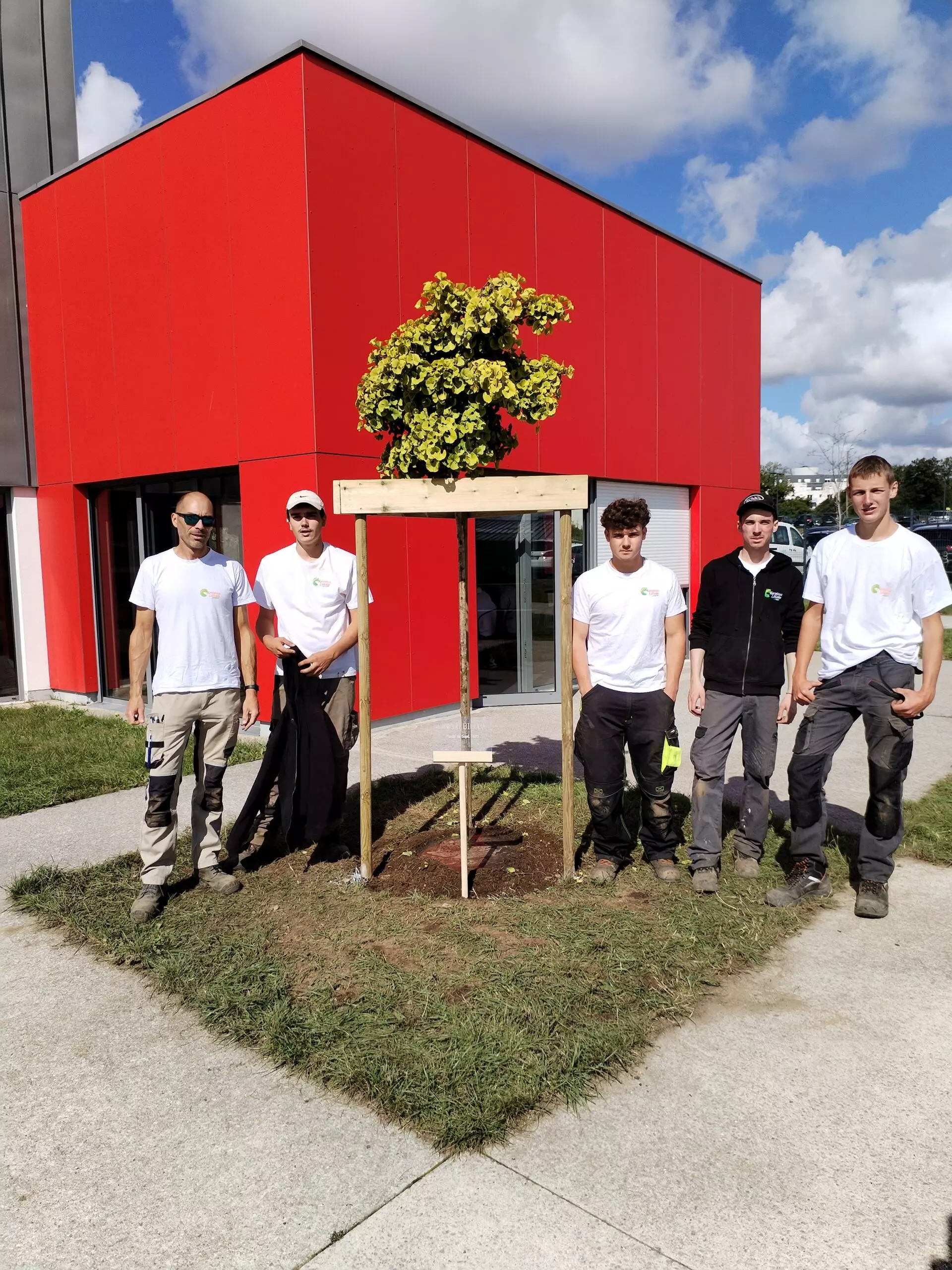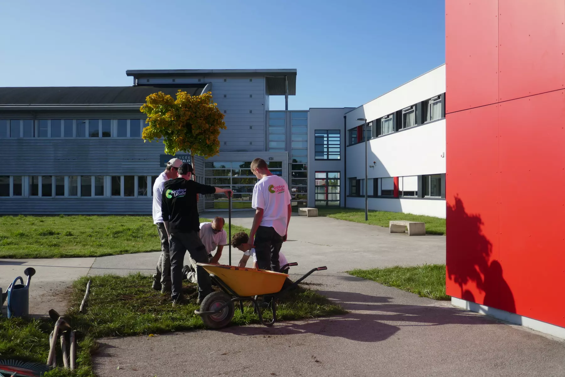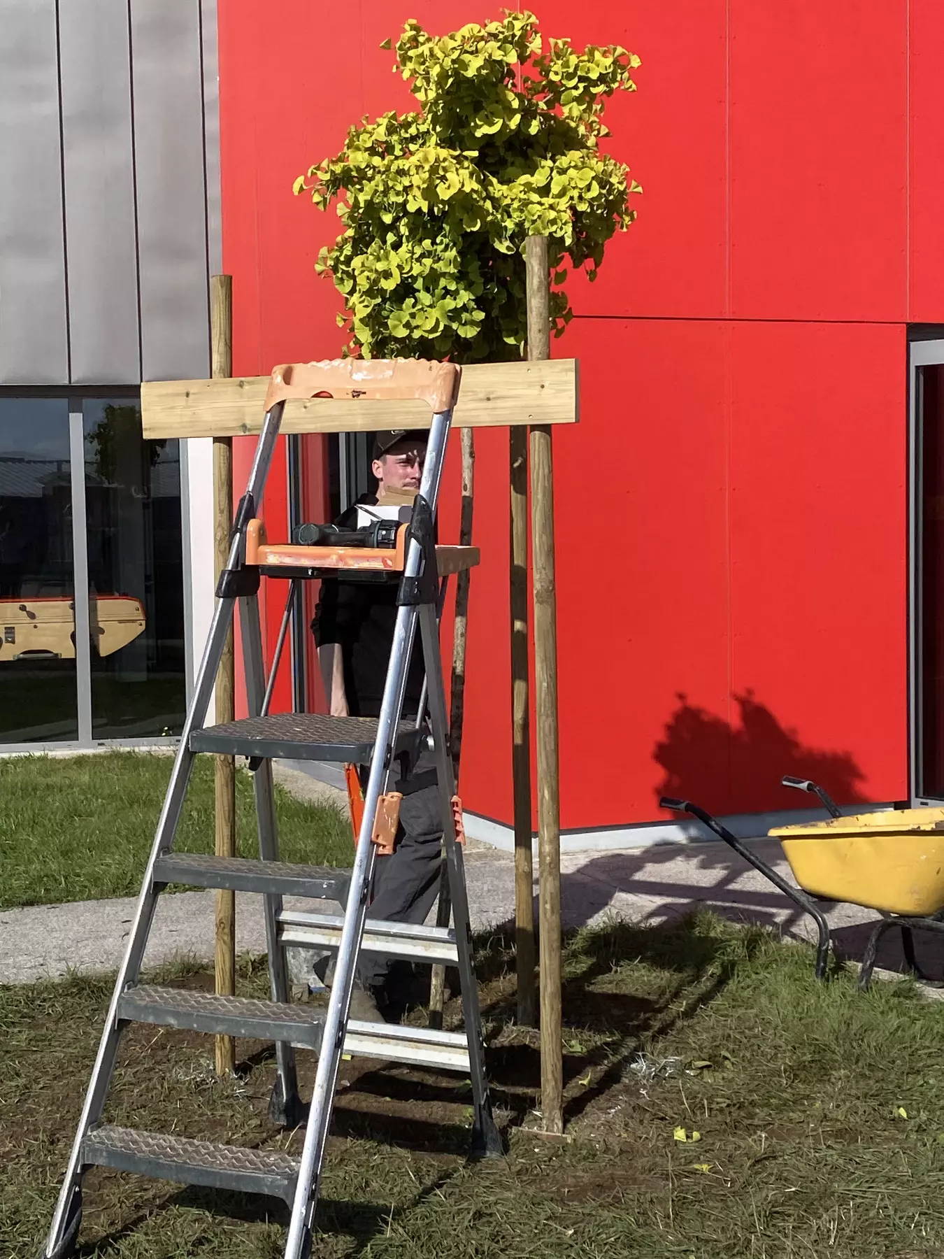 À la demande du Lycée St Joseph de Vannes, afin de rendre hommage à un jeune tragiquement disparu cet été, 4 élèves en terminale bac professionnel Aménagements Paysagers ont réalisé la plantation d’un Ginkgo biloba ‘Mariken’. Cette variété au développement beaucoup plus lent et au port plus compact que l’espèce type est tout à fait adaptée aux contraintes du site. Un tuteurage en tripode a été nécessaire pour maintenir l’arbre sur ses premières années en attendant qu’il s’ancre et se familiarise avec son nouveau milieu.