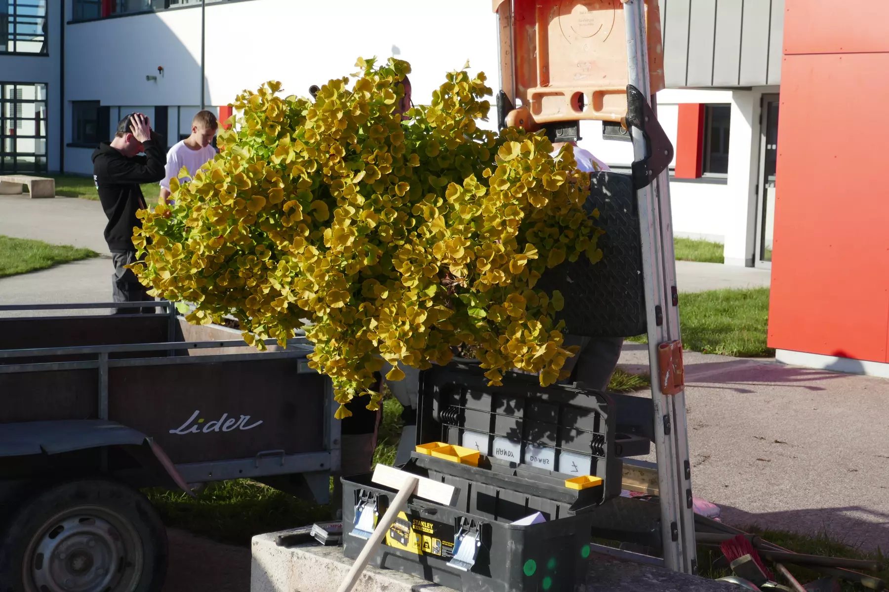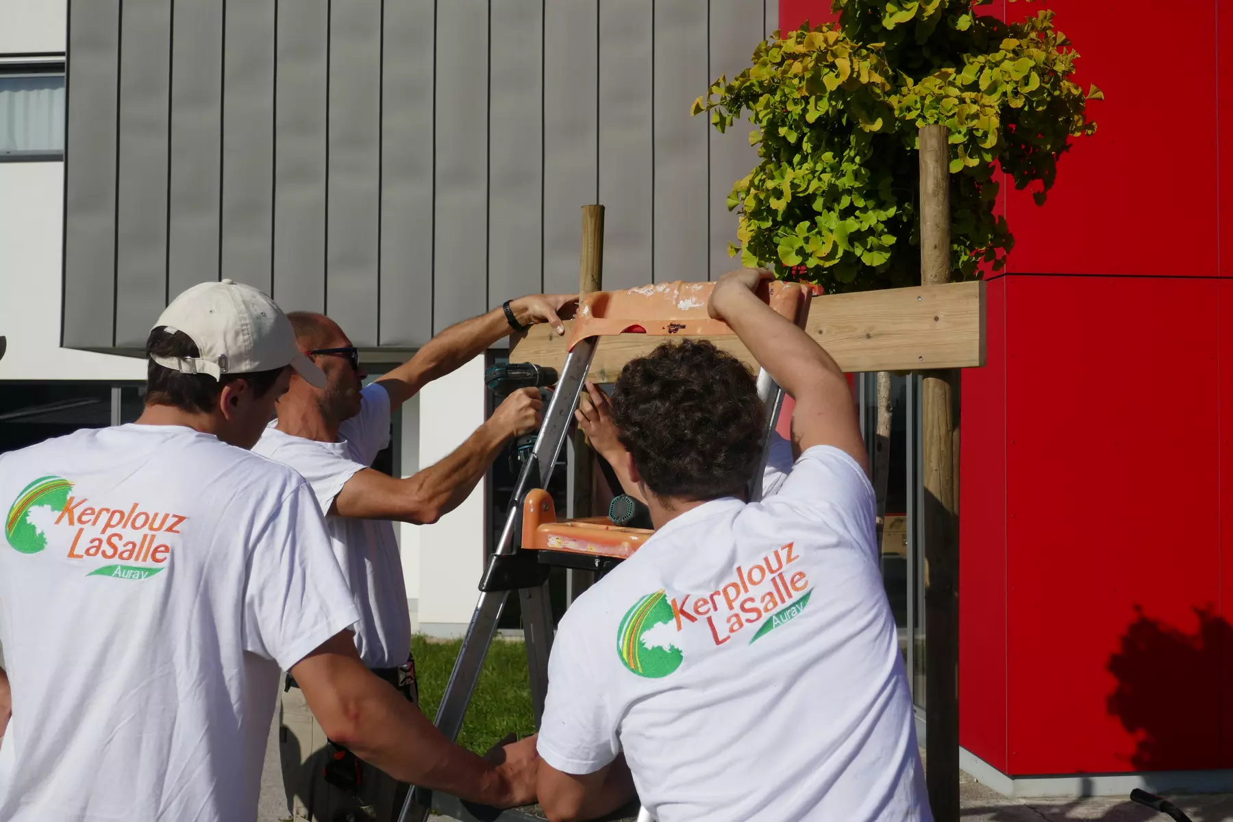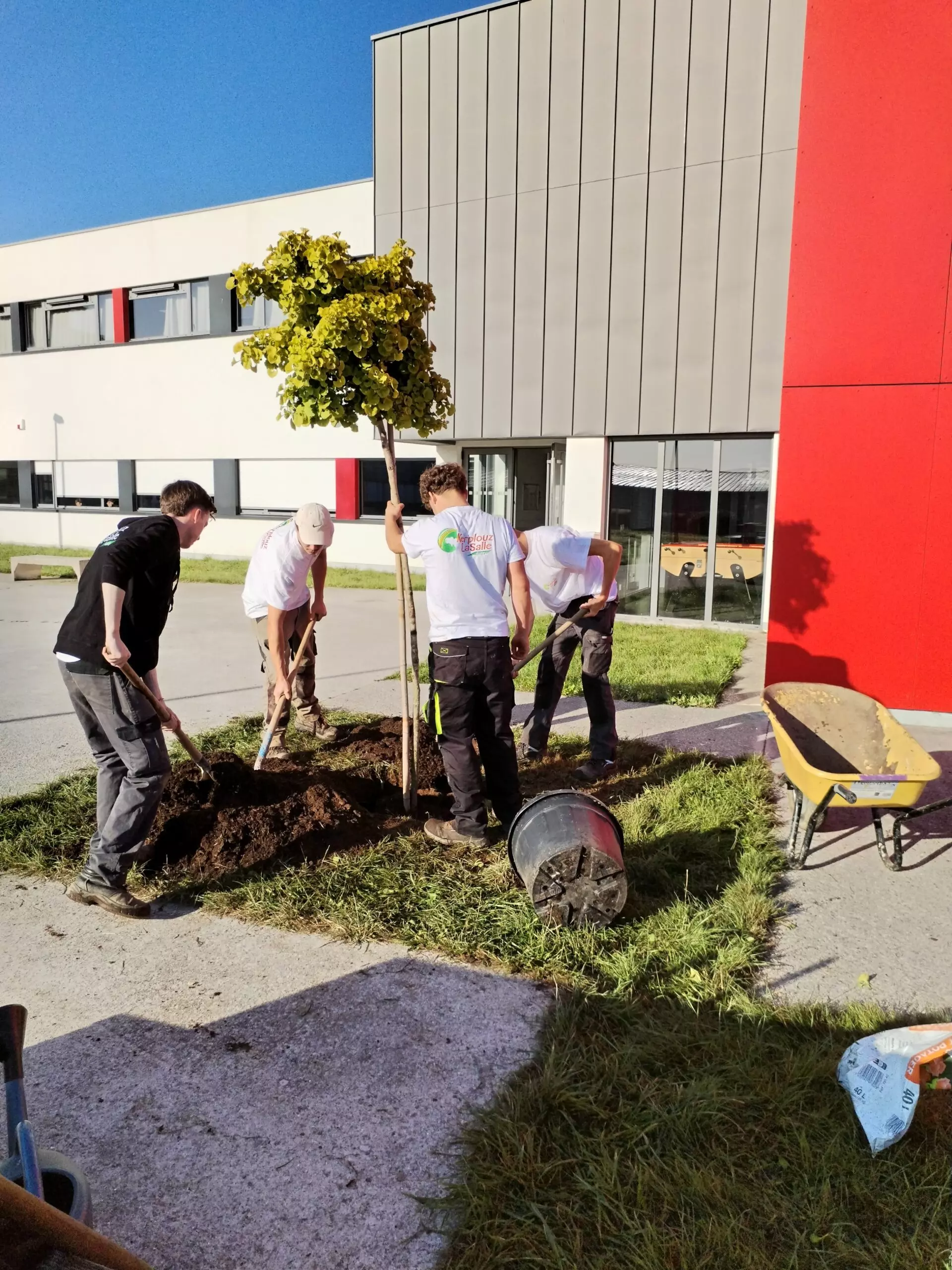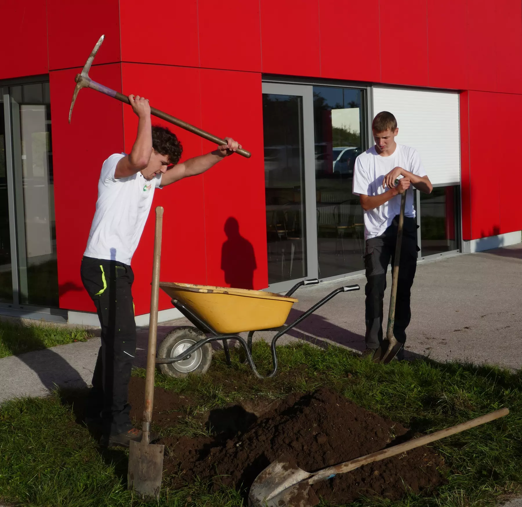 À la demande du Lycée St Joseph de Vannes, afin de rendre hommage à un jeune tragiquement disparu cet été, 4 élèves en terminale bac professionnel Aménagements Paysagers ont réalisé la plantation d’un Ginkgo biloba ‘Mariken’. Cette variété au développement beaucoup plus lent et au port plus compact que l’espèce type est tout à fait adaptée aux contraintes du site. Un tuteurage en tripode a été nécessaire pour maintenir l’arbre sur ses premières années en attendant qu’il s’ancre et se familiarise avec son nouveau milieu.