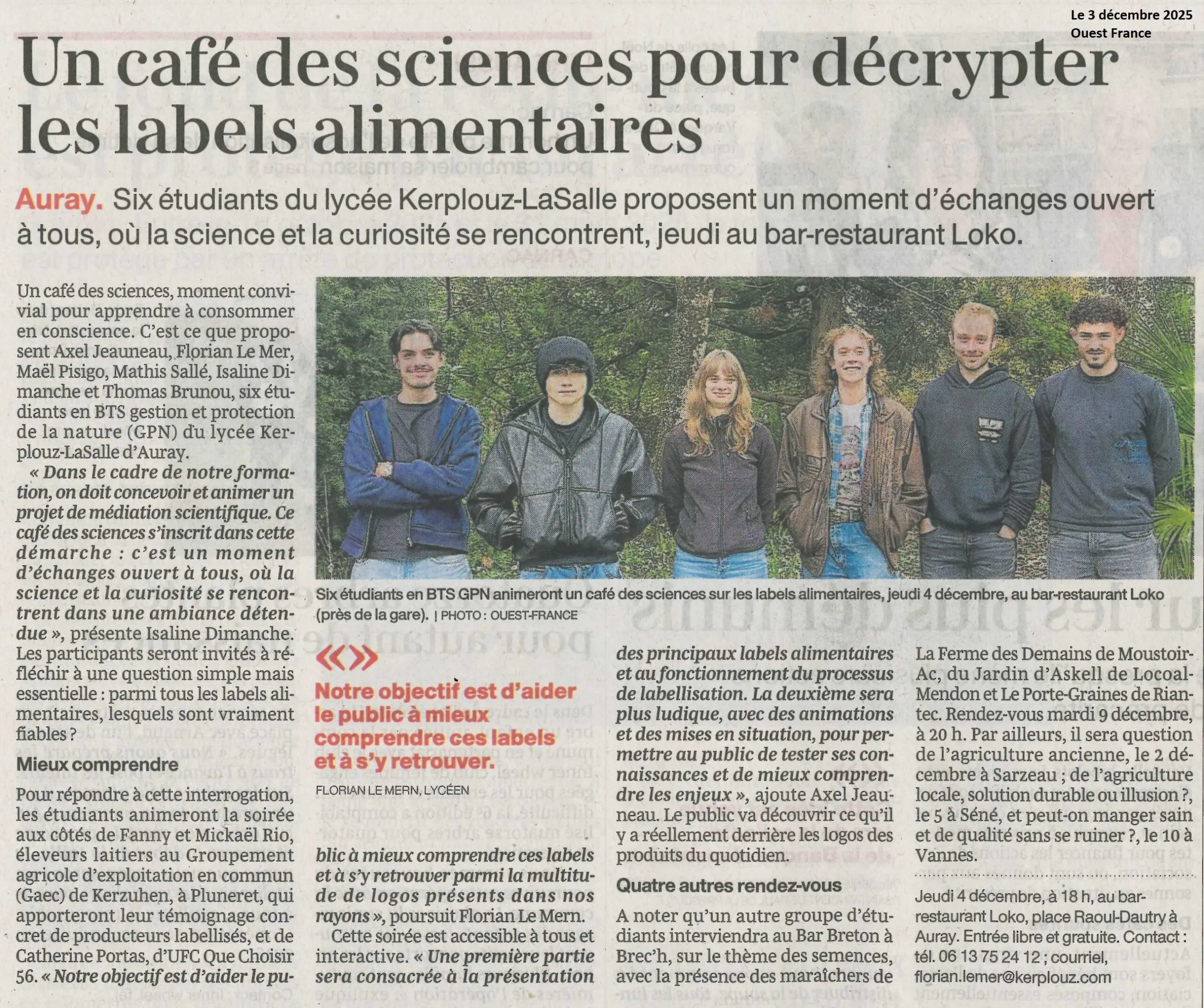 Un café des sciences pour décrypter les labels alimentaires par CDI | 3 Déc 2025 | BTS Gestion et Protection de la Nature, La presse en parle | 0 commentaires Poster le commentaire Annuler la réponseVotre adresse e-mail ne sera pas publiée. Les champs obligatoires sont indiqués avec *Commentaire * Nom * E-mail * Site web Δ Ce site utilise Akismet pour réduire les indésirables. En savoir plus sur la façon dont les données de vos commentaires sont traitées.