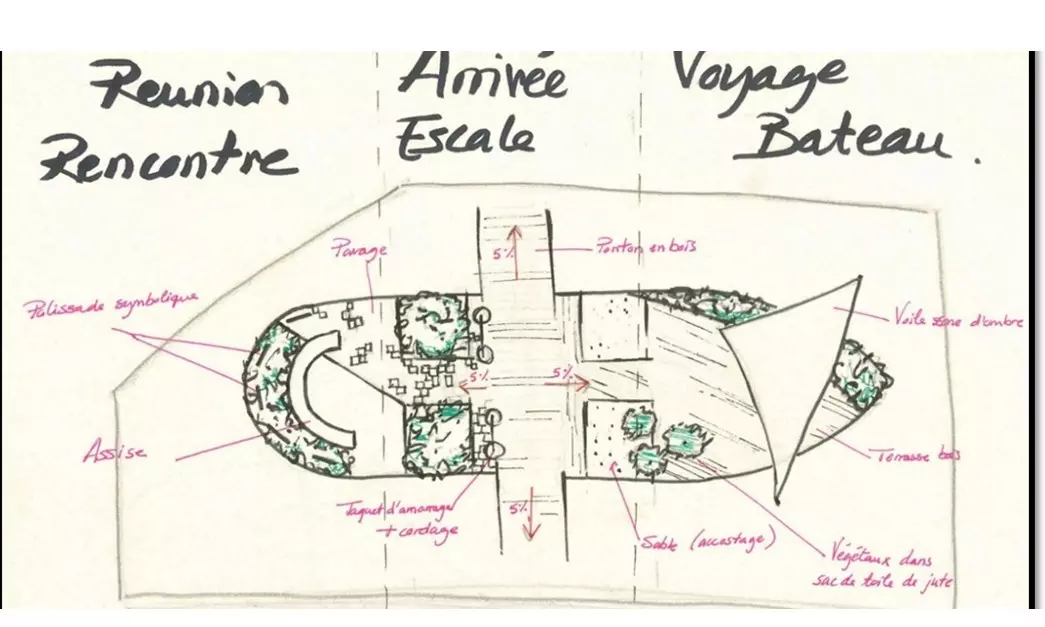 Durant 4 journées, les BTS AP1 ont réalisé un jardin « bateau » par la construction de bac en bois reprenant les grandes lignes d’un navire à quai : à l’ouest se trouve la poupe et à l’est la proue. Il se divise en trois grandes parties significatives du passage de Benjamin Franklin : le voyage en bateau, l’arrivée ou l’escale sur la côte et enfin la rencontre et la réunion franco-américaine. Il est était impossible de modifier le terrain pour des raisons de protection archéologique. L’ensemble de la réalisation est donc posée sans creusement du sol