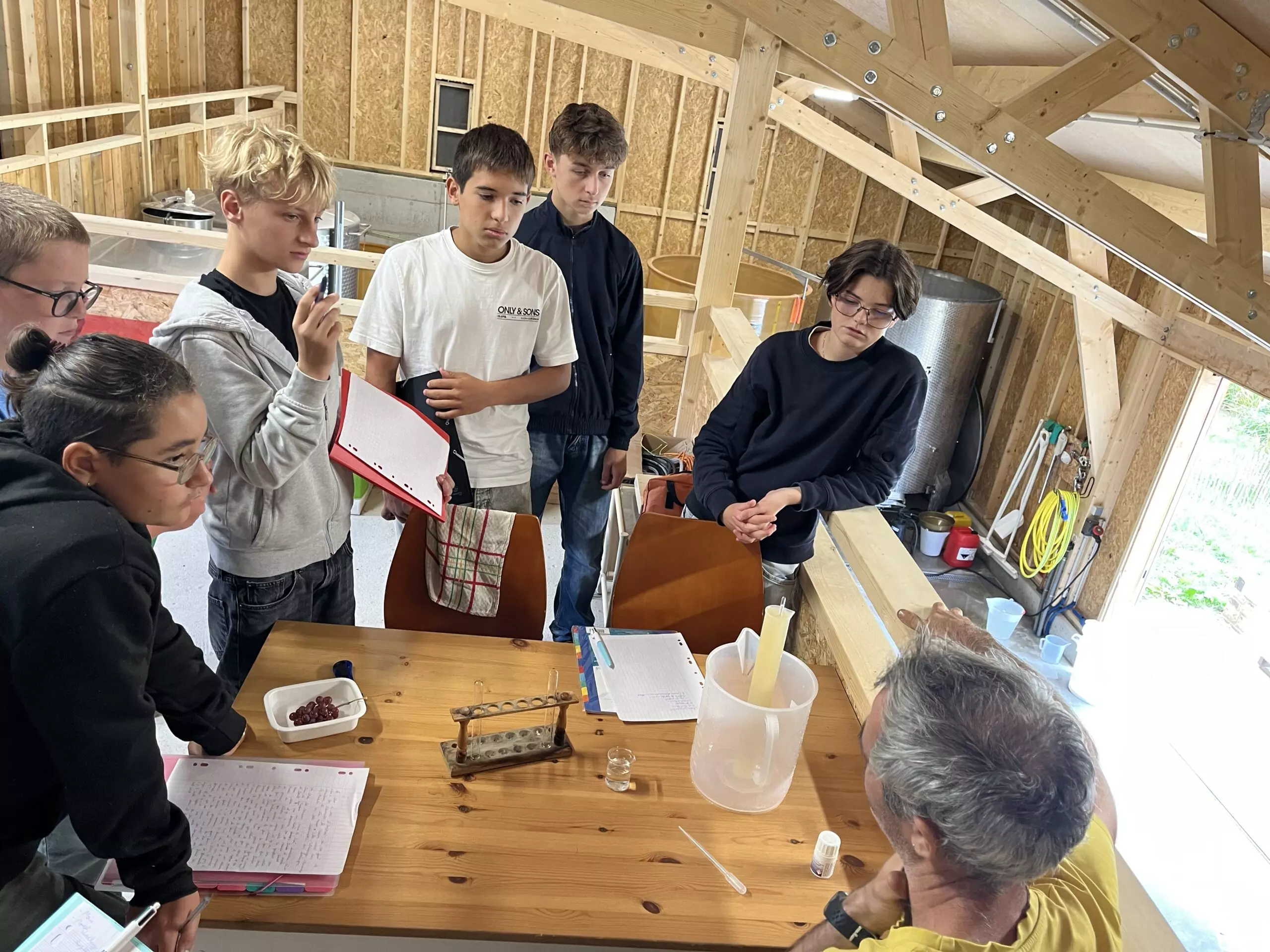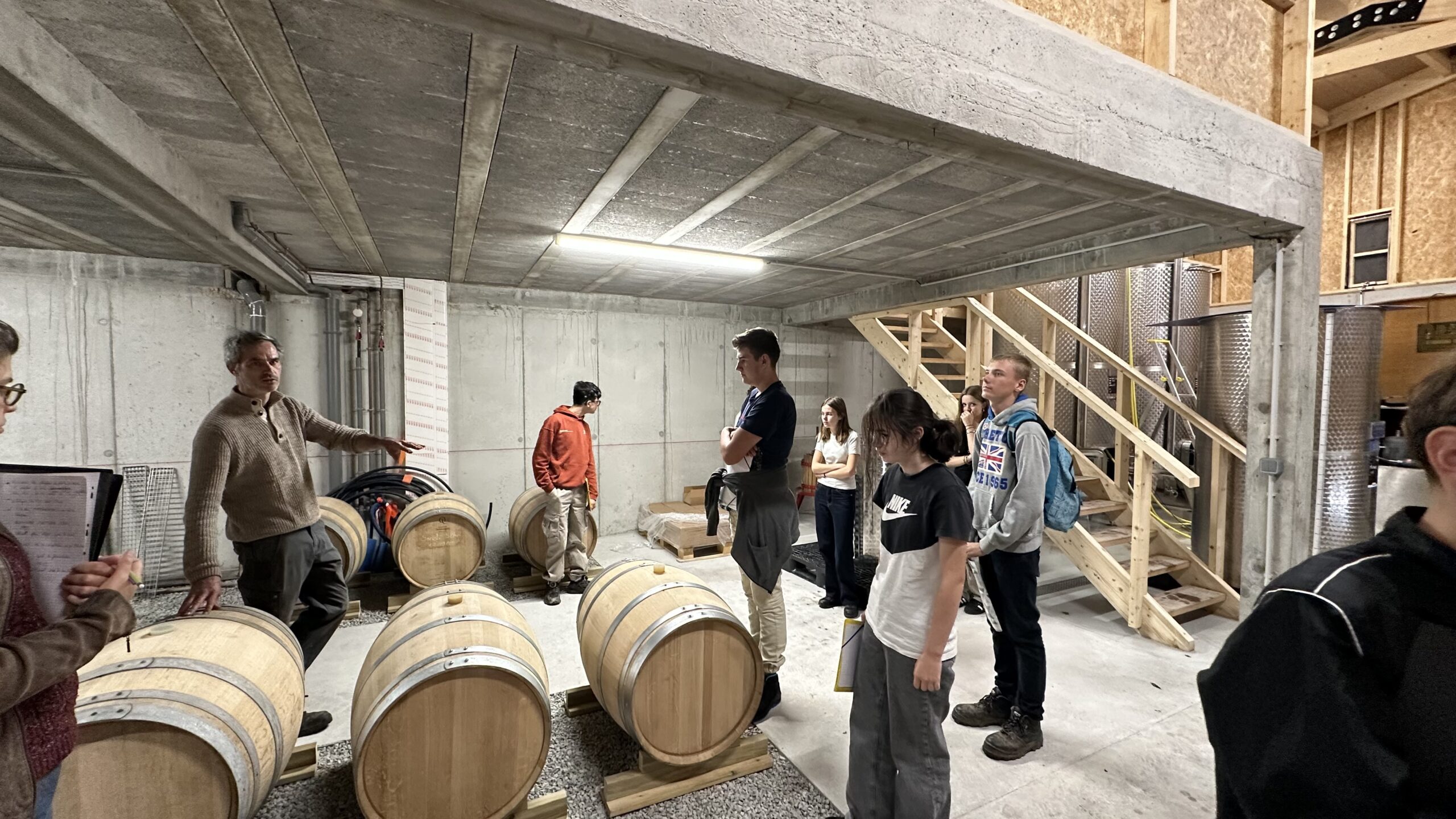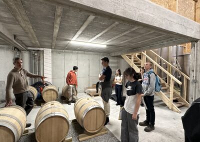 Dès leur arrivée au chai, les élèves ont été accueillis par Aurélien BERTHOU et Lucile HALLIOT, qui leurs ont présentés l’histoire des vignes de Kerplouz, ainsi que les différentes étapes de la vinification. De la réception des vendanges aux cuves de fermentation, en passant par les barriques de chêne où le vin repose, chaque espace du chai leur a été expliqué avec précision. Les élèves ont pu poser de nombreuses questions, notamment sur les métiers qui gravitent autour de ce secteur : viticulteur, œnologue, maître de chai ou encore caviste.