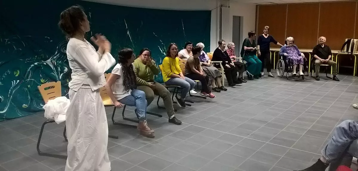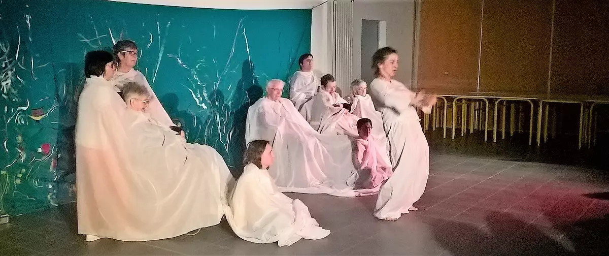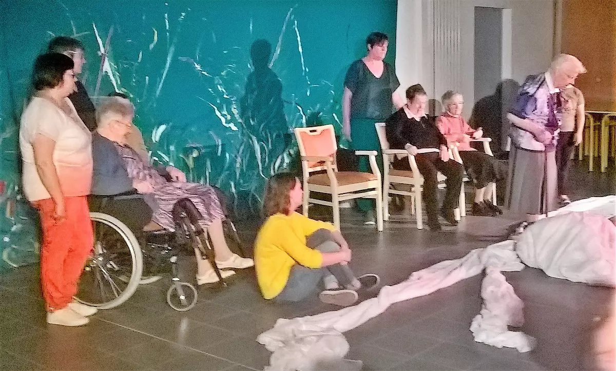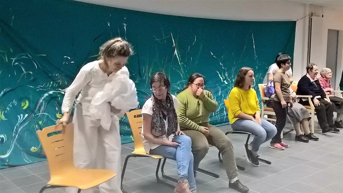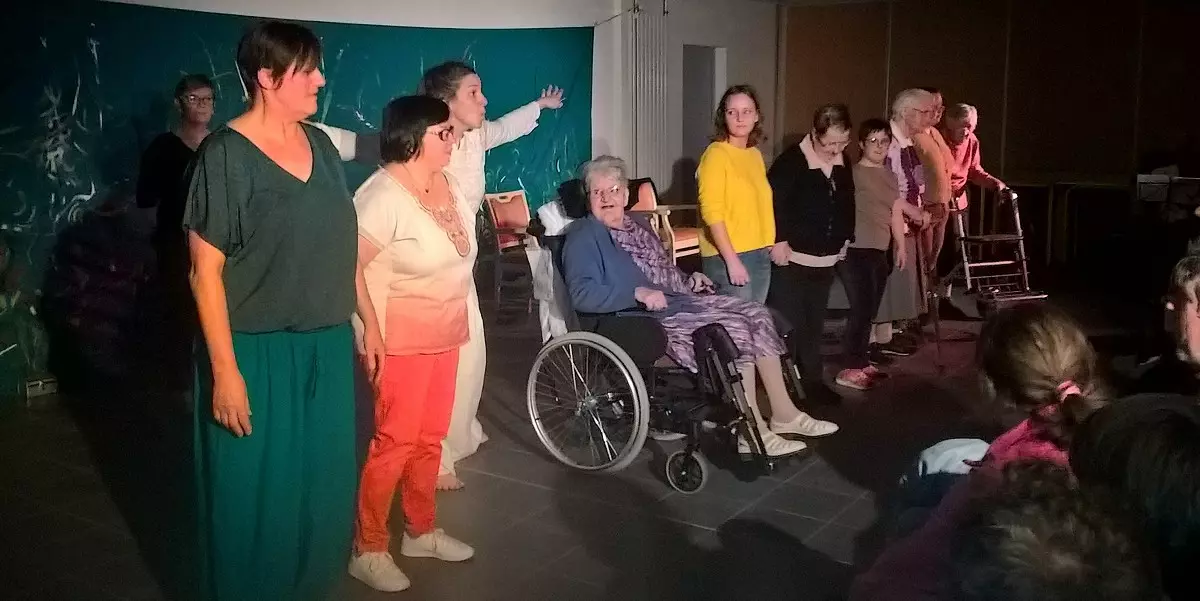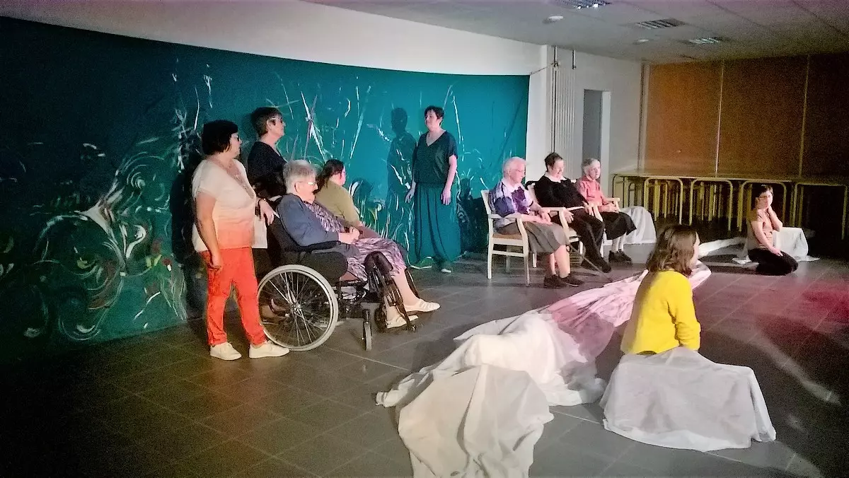 Encadrée par Julia Höfler, comédienne, et Armel Mandart, metteur en scène et musicien, elle est constituée de quatre résidentes de l’Ehpad de la Chartreuse, de deux aide-soignantes et d’une aide-médico-psychologique, d’une jeune en service civique et de deux membres de La Belle Porte, association qui accompagne des personnes en situation de handicap mental.